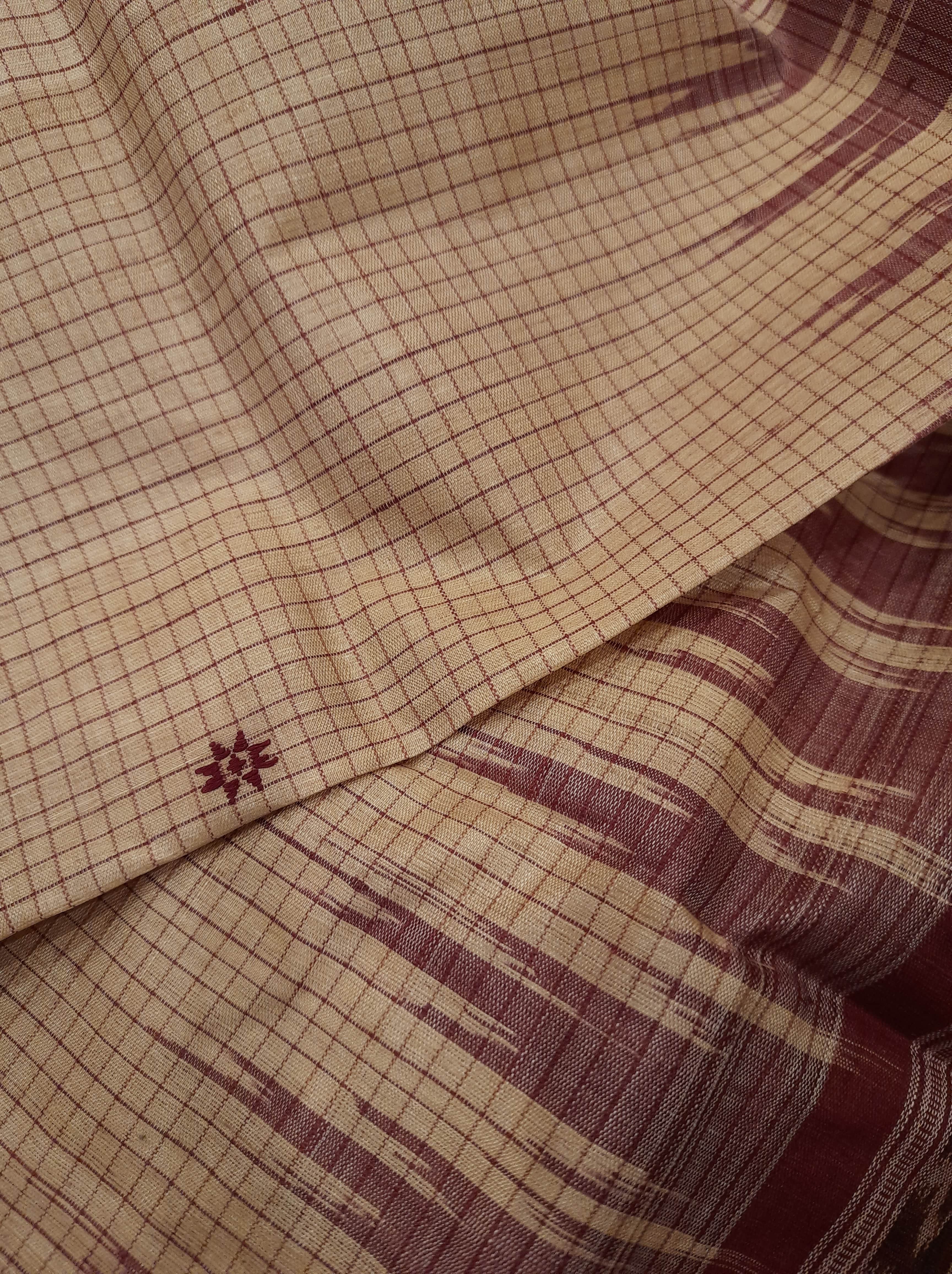 Beige checked body Gangajamuna border Cotton Odisha Ikat saree with matching cotton ikat blouse
