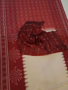 Beige and Maroon wide border Cotton Odisha Ikat saree with cotton ikat blouse piece
