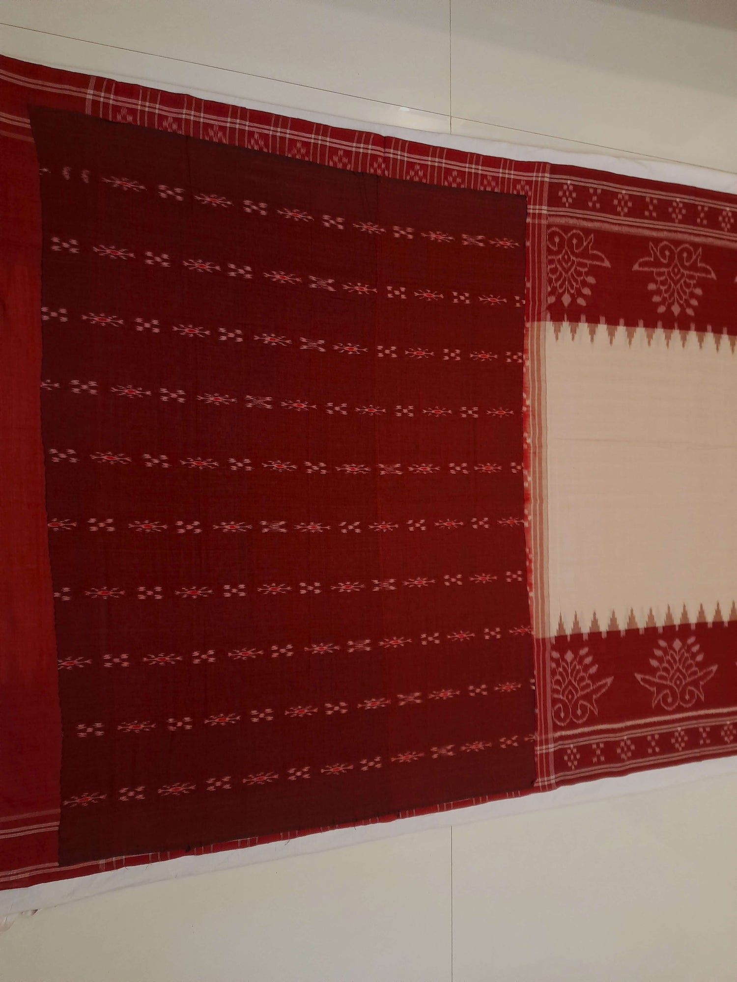 Beige with Maroon Cotton Odisha Ikat saree with mix match cotton ikat blouse