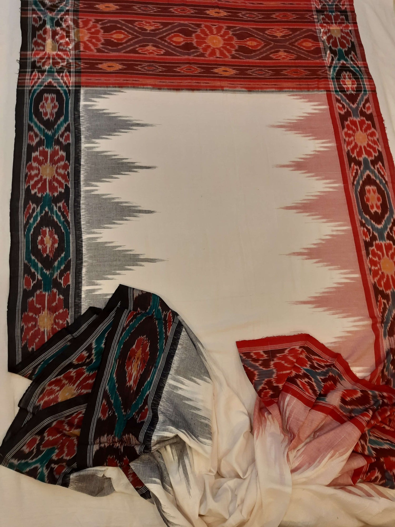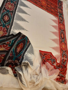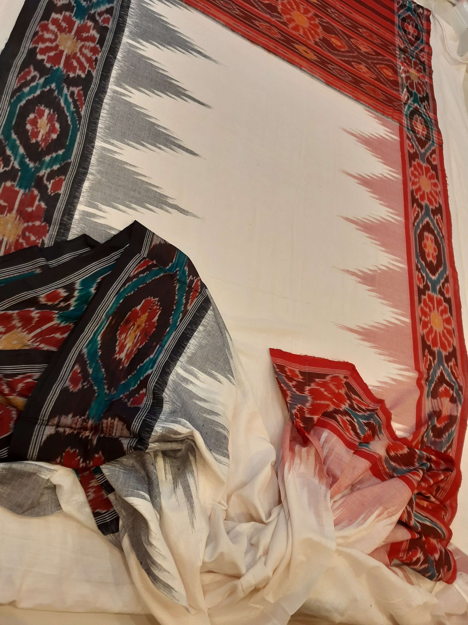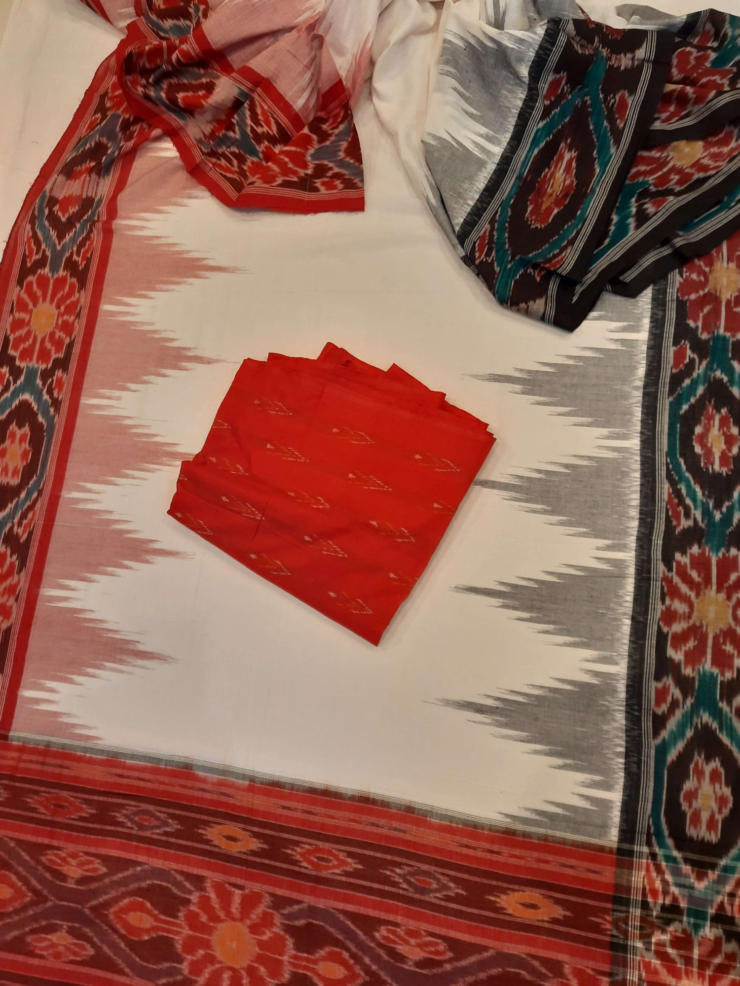 White with Red Cotton Odisha Ikat saree with mix match cotton ikat blouse piece