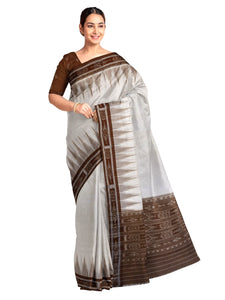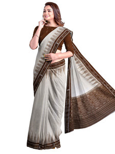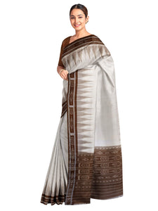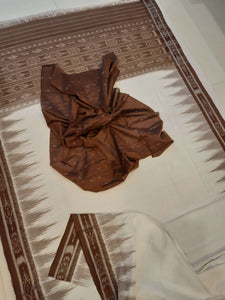 White and Brown coloured Odisha Ikat saree with cotton ikat blouse piece
