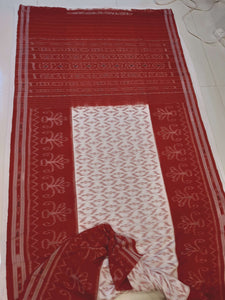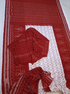White with Red Cotton Odisha Ikat saree with mix match cotton ikat blouse piece