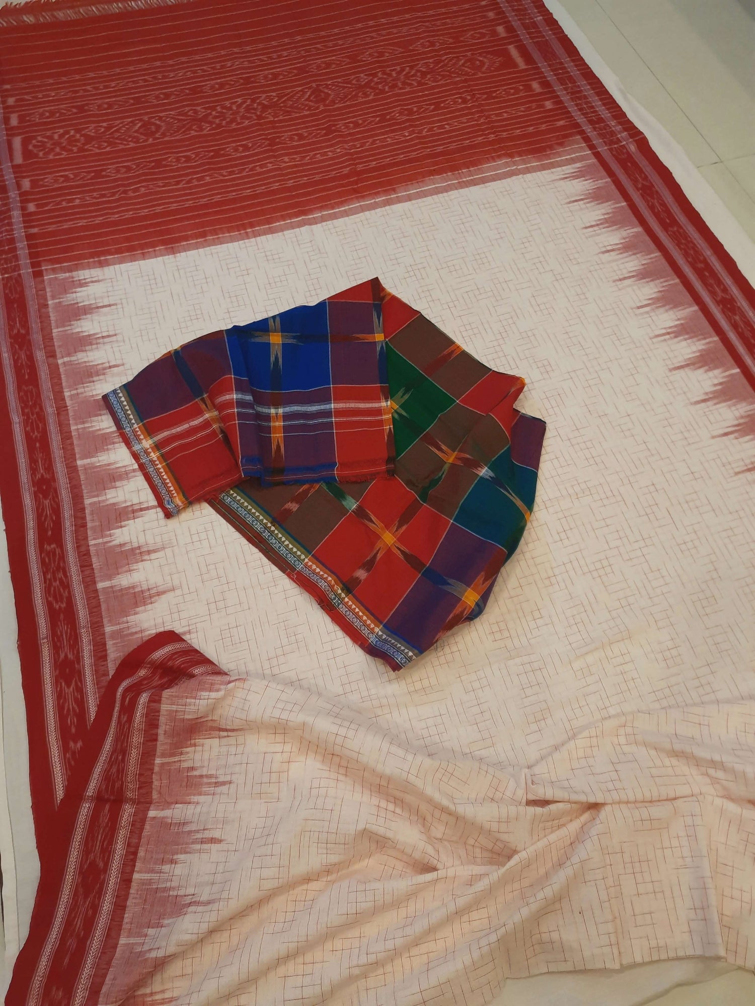 White with Red Cotton Odisha Ikat saree with mix match cotton ikat blouse piece