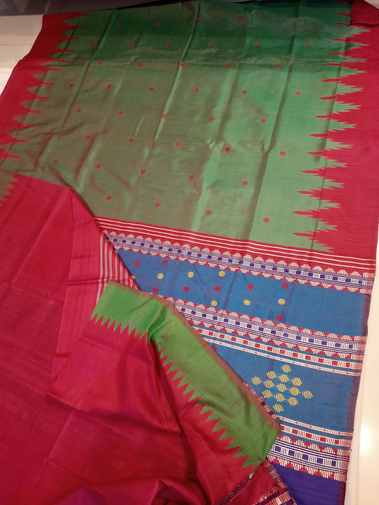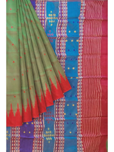- The refreshing green body adorned with delicate butis pairs gracefully with a striking pink Phoda Kumbha border, a signature hallmark of Berhampuri weaves.