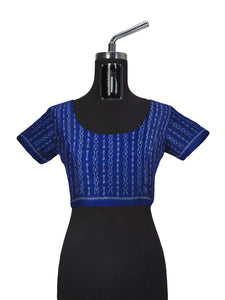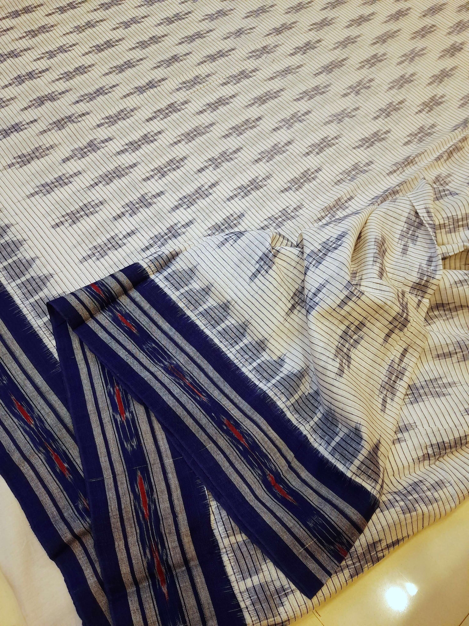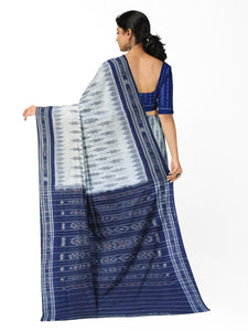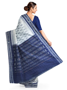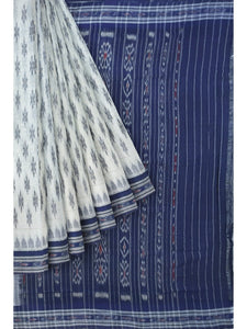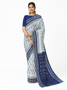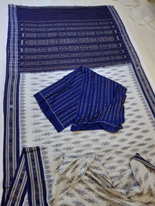 White with Blue Cotton Odisha Ikat saree with cotton ikat blouse piece