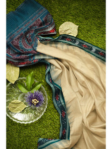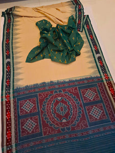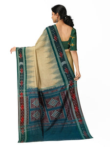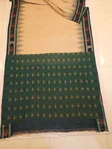 Beige with Green Cotton Odisha Ikat saree with cotton ikat blouse piece