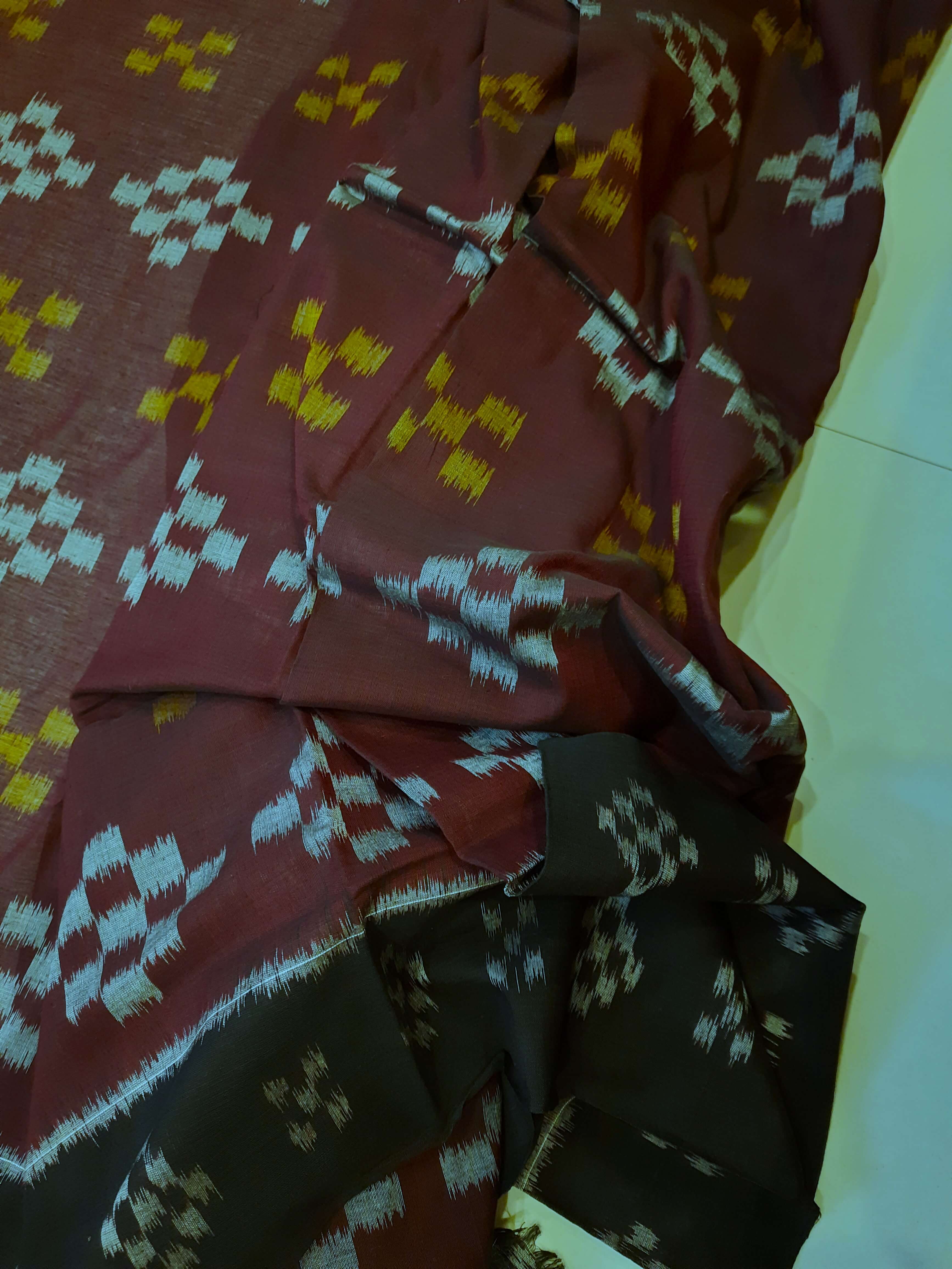 Brown Cotton Odisha Ikat saree with mix match cotton ikat blouse piece