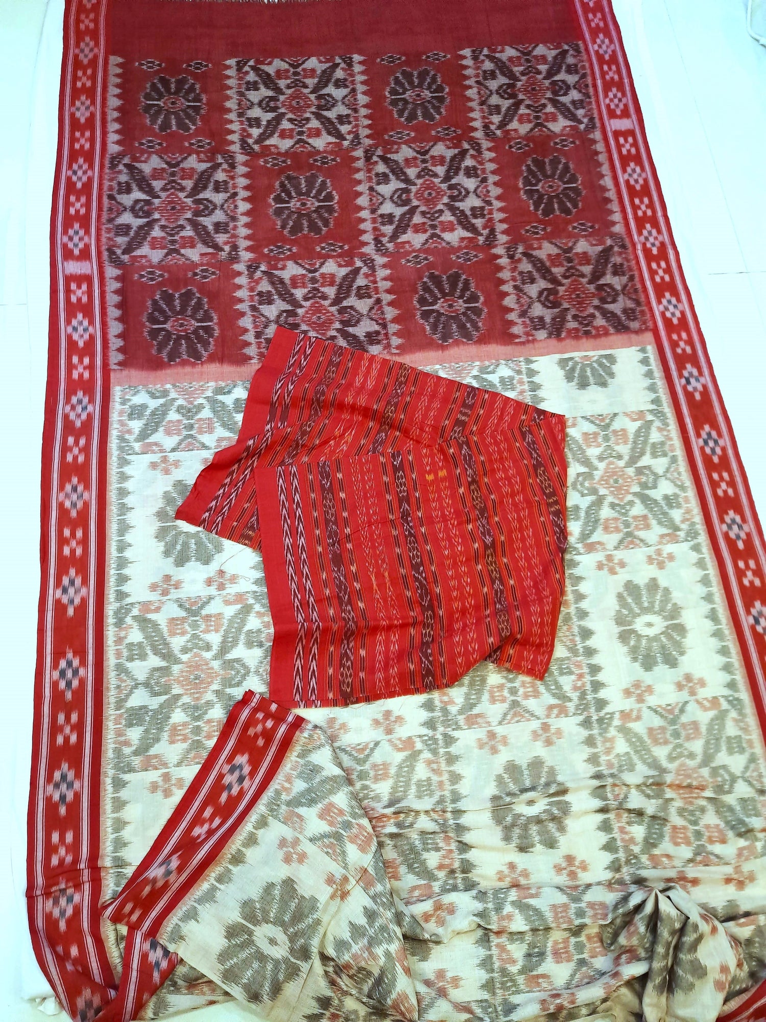 White with Red Cotton Odisha Ikat saree with mix match cotton ikat blouse piece