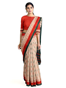 - A beautiful blend of red and green, this handloom cotton saree features motifs with a double border and traditional anchal—a subtle nod to Odisha’s weaving heritage.