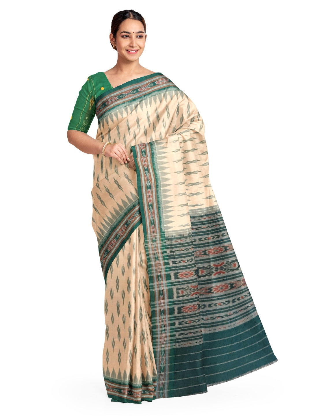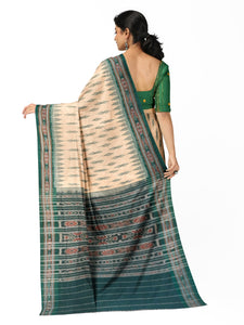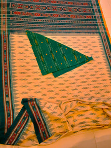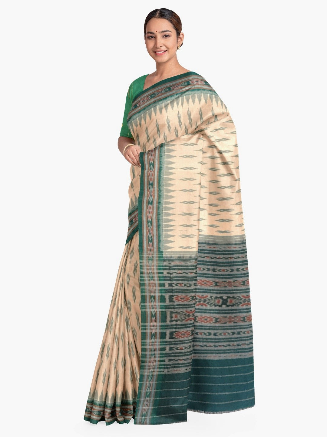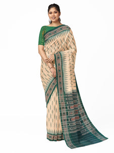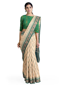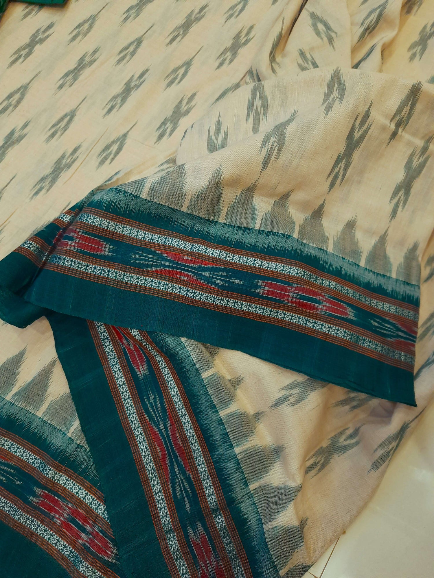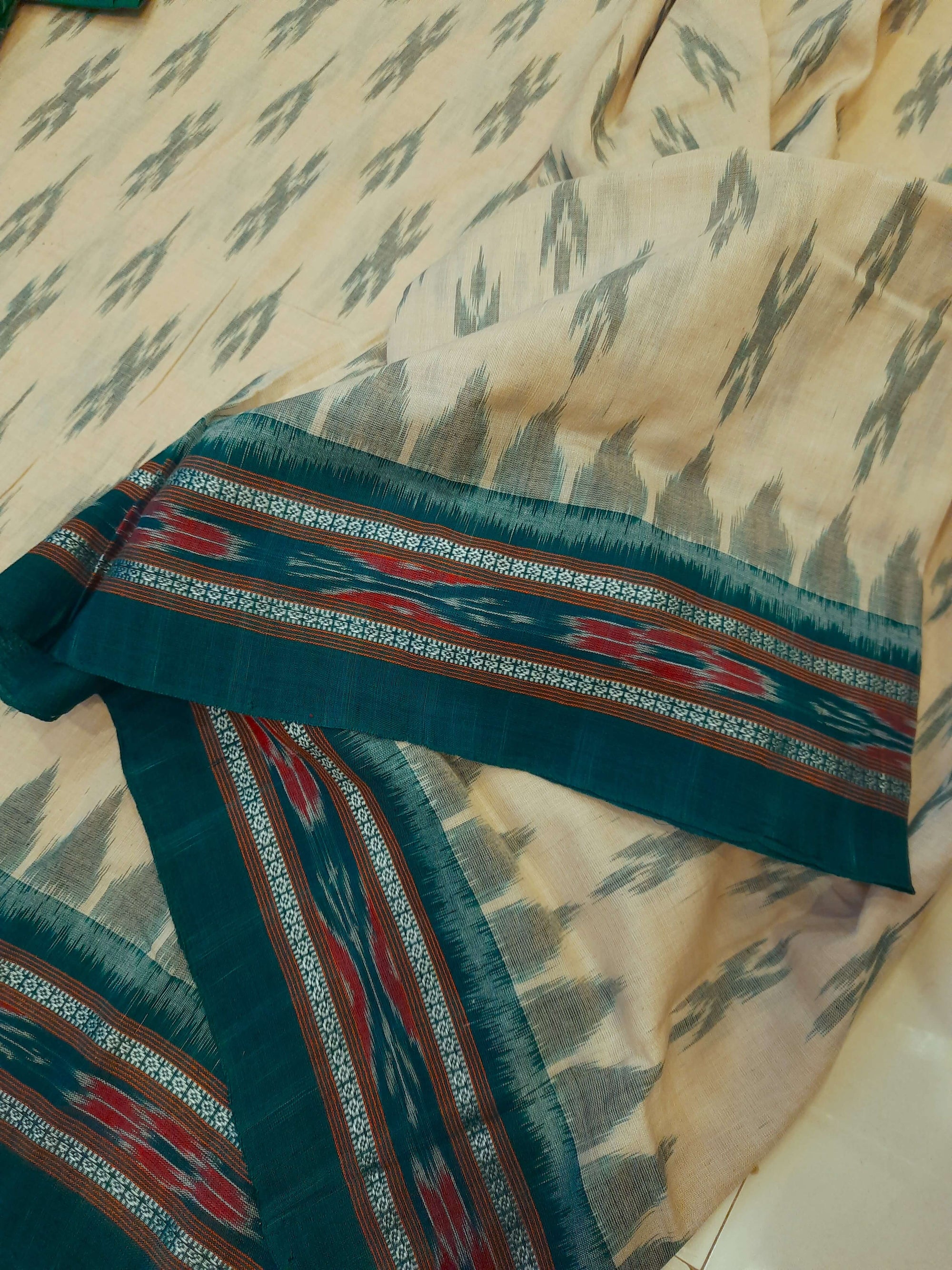 Beige with Green Cotton Odisha Ikat saree with cotton ikat blouse piece