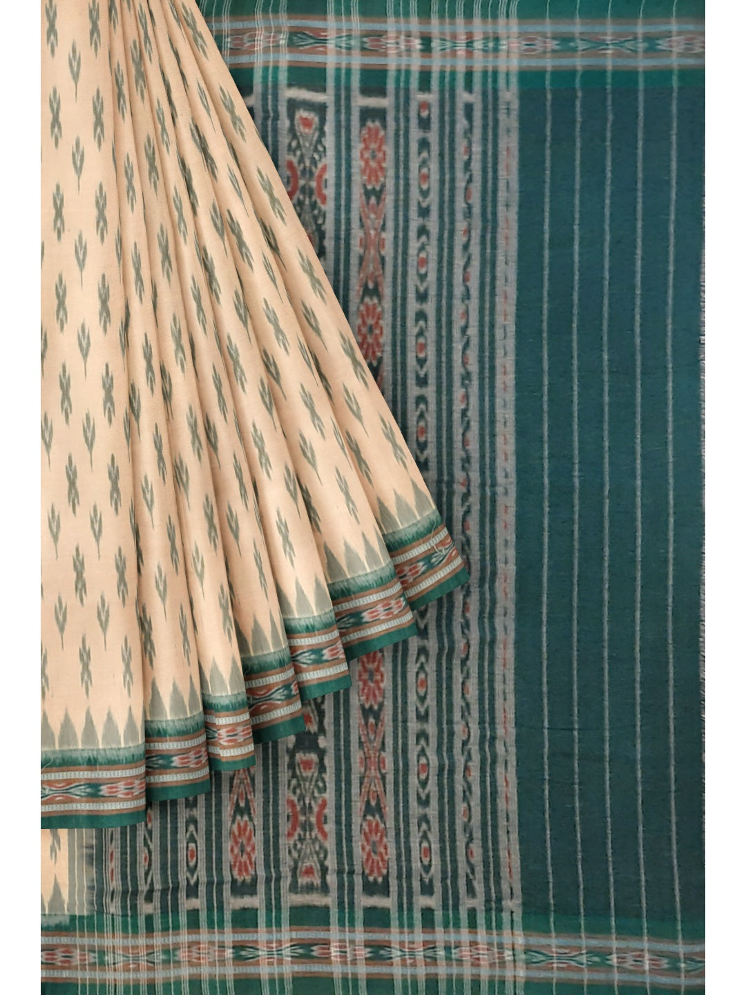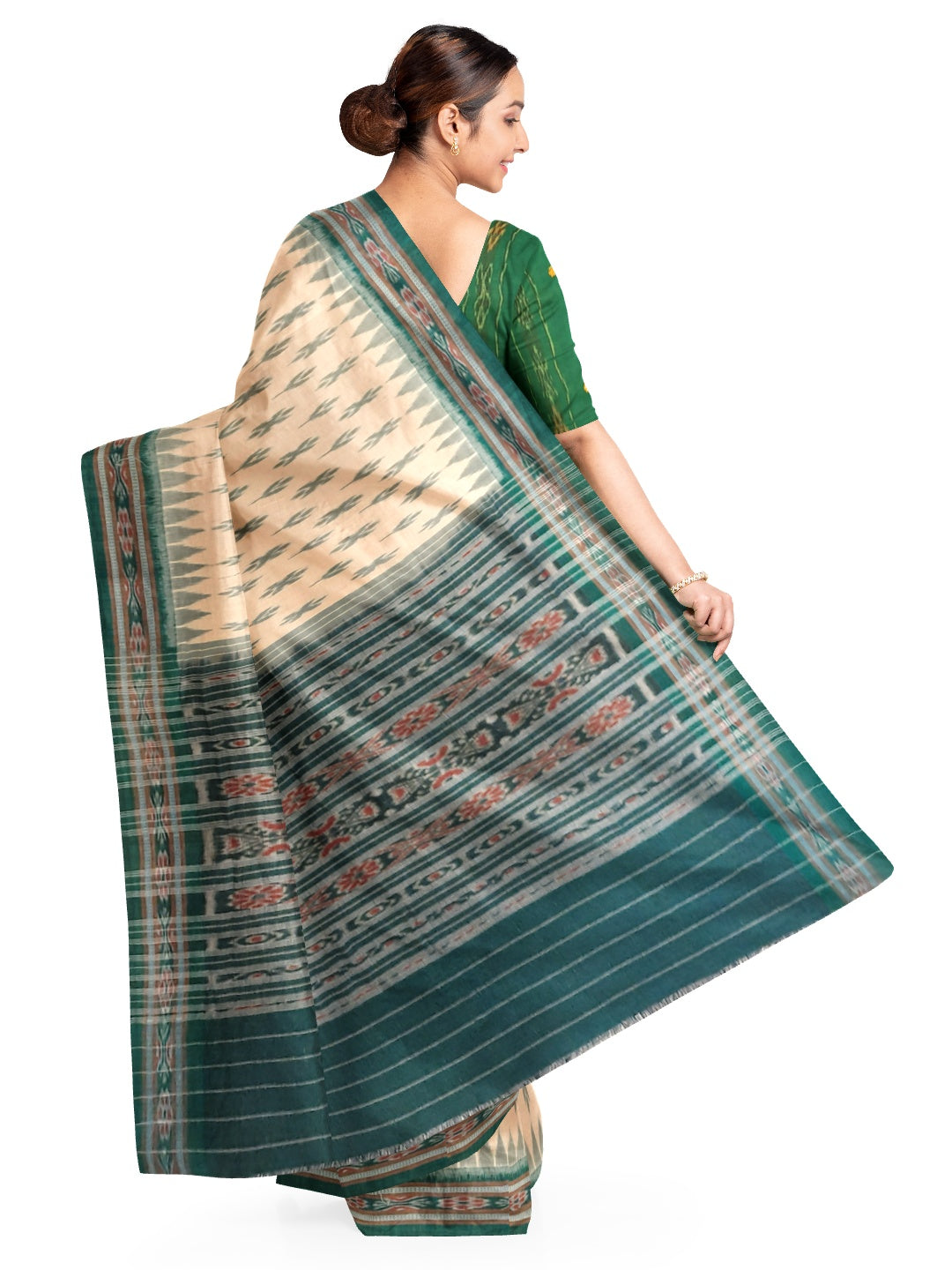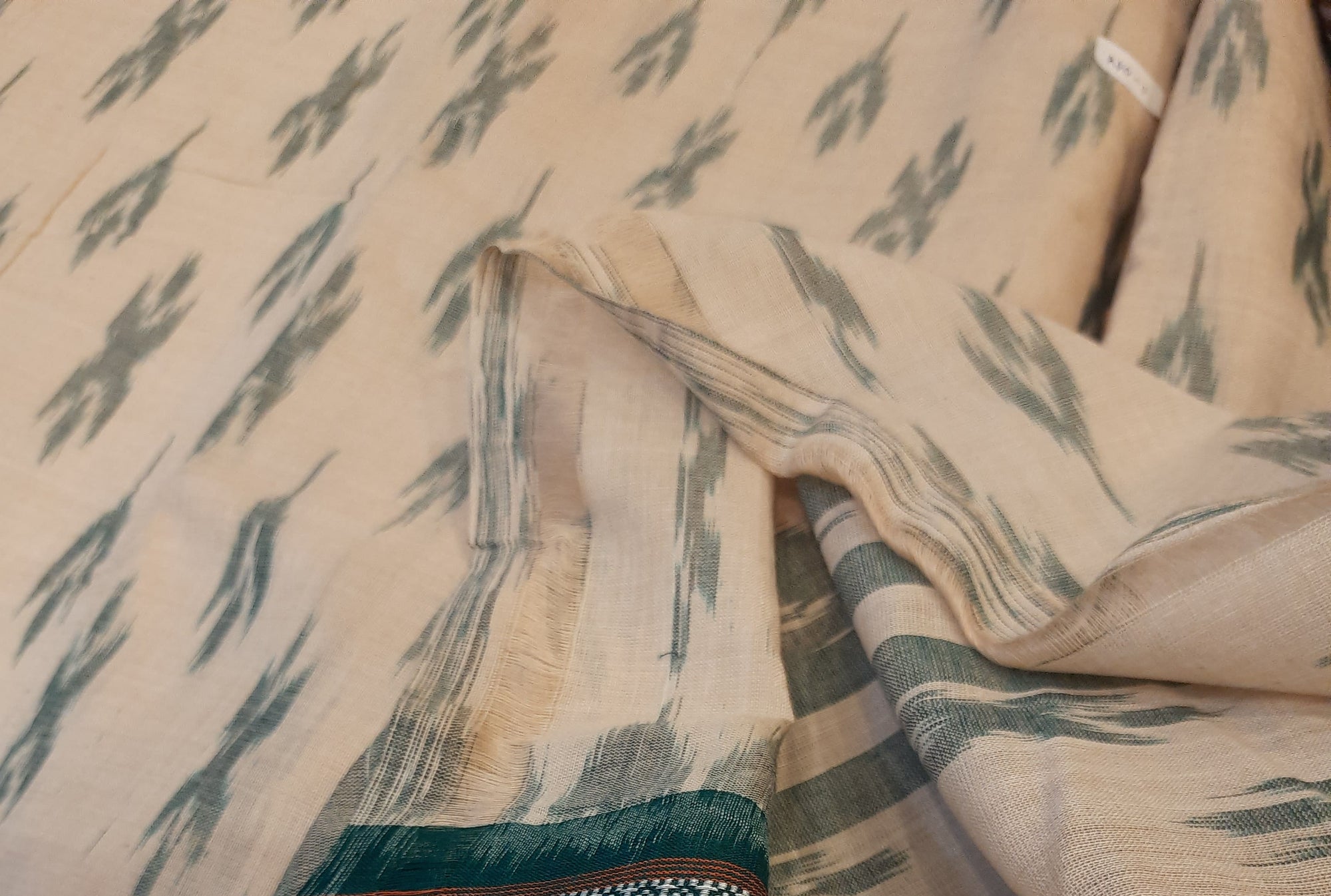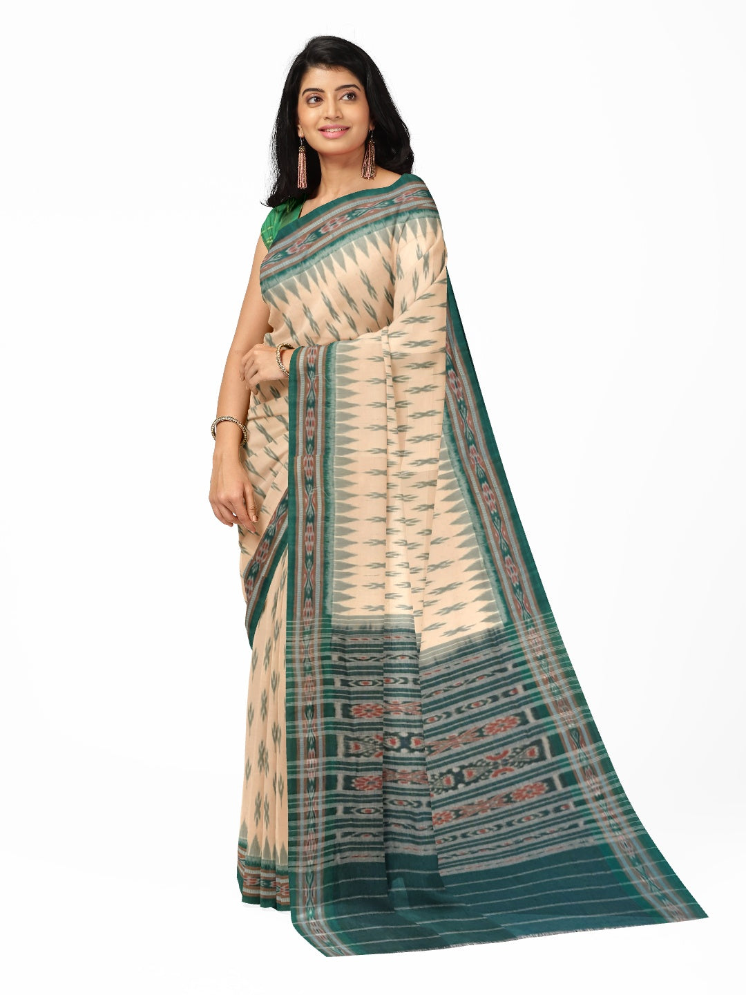 Beige with Green Cotton Odisha Ikat saree with cotton ikat blouse piece