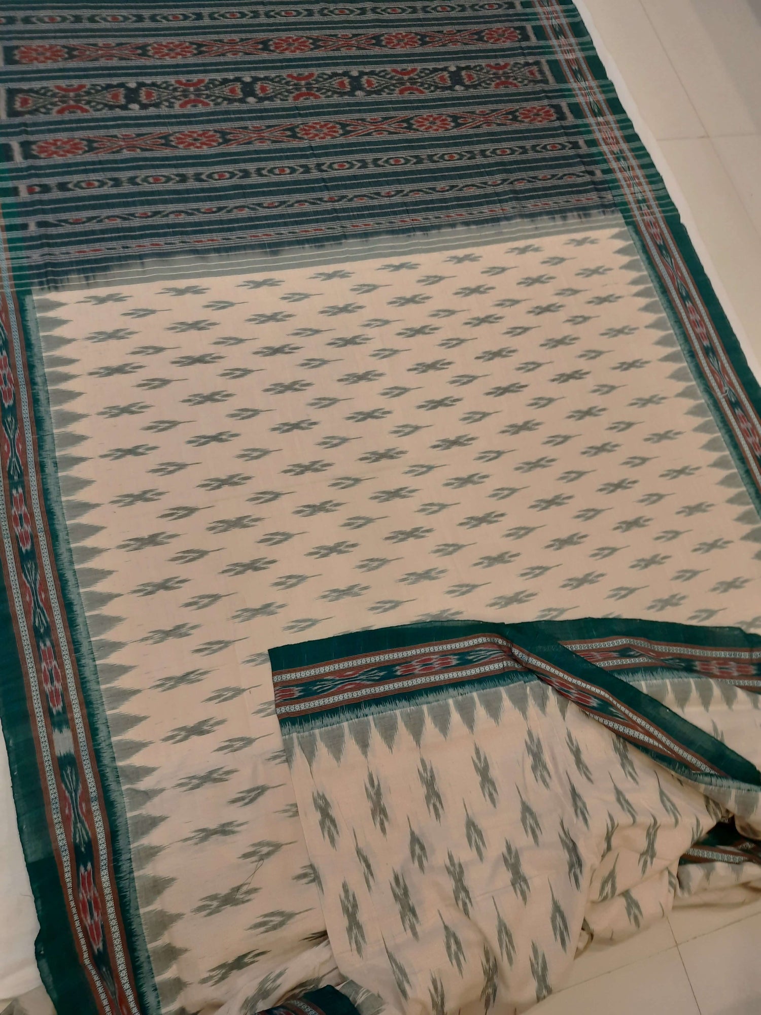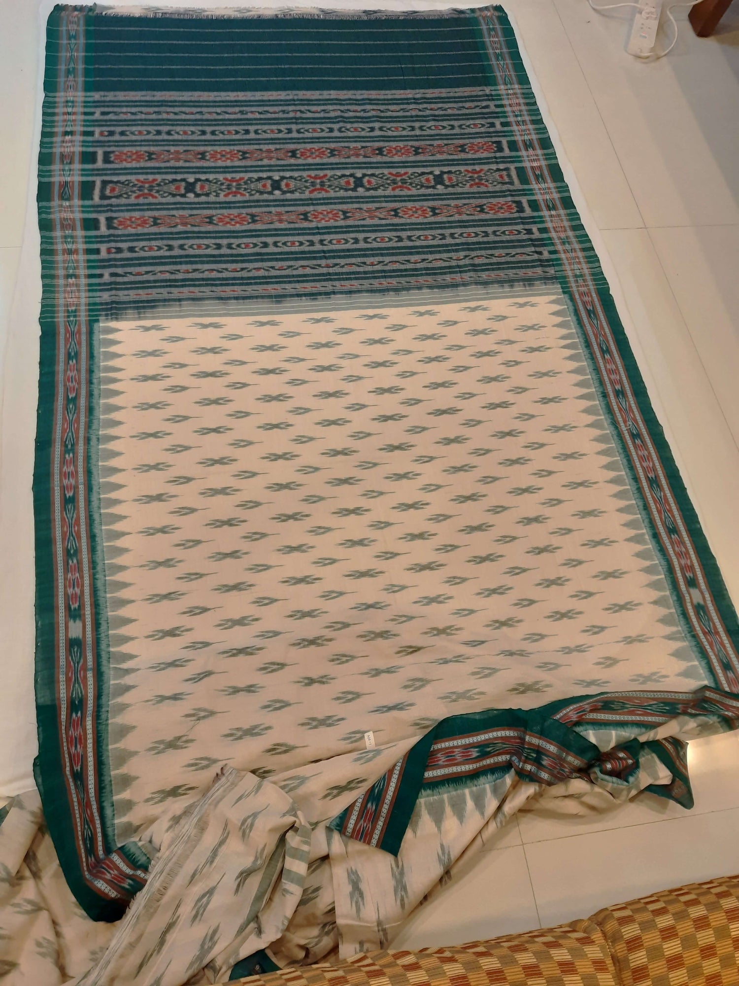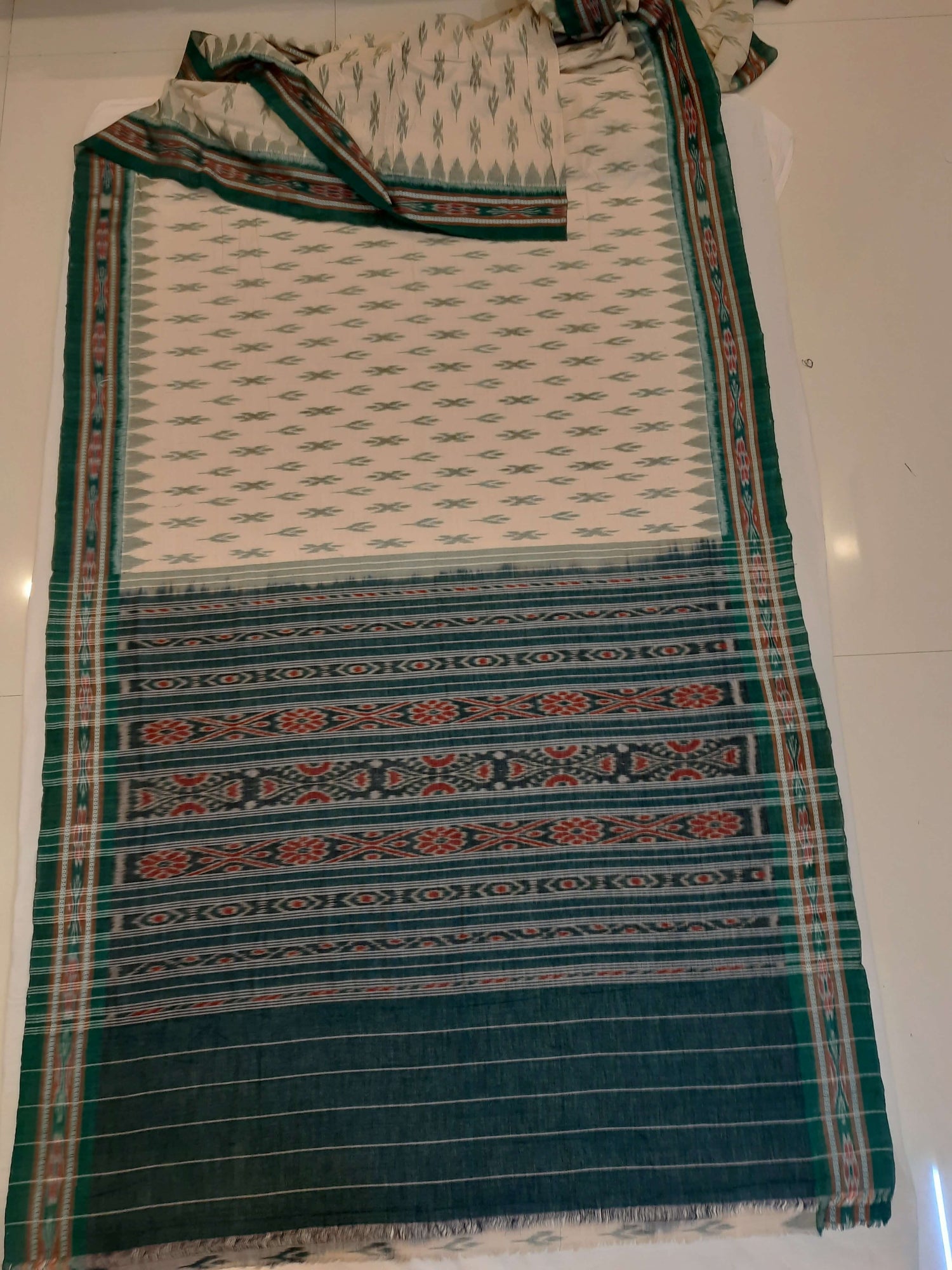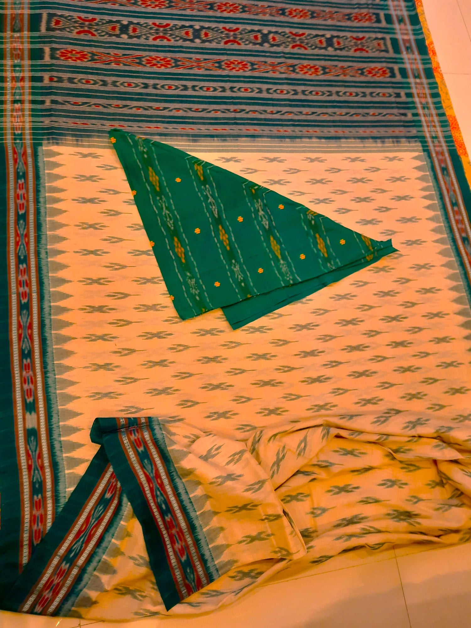 Beige with Green Cotton Odisha Ikat saree with cotton ikat blouse piece