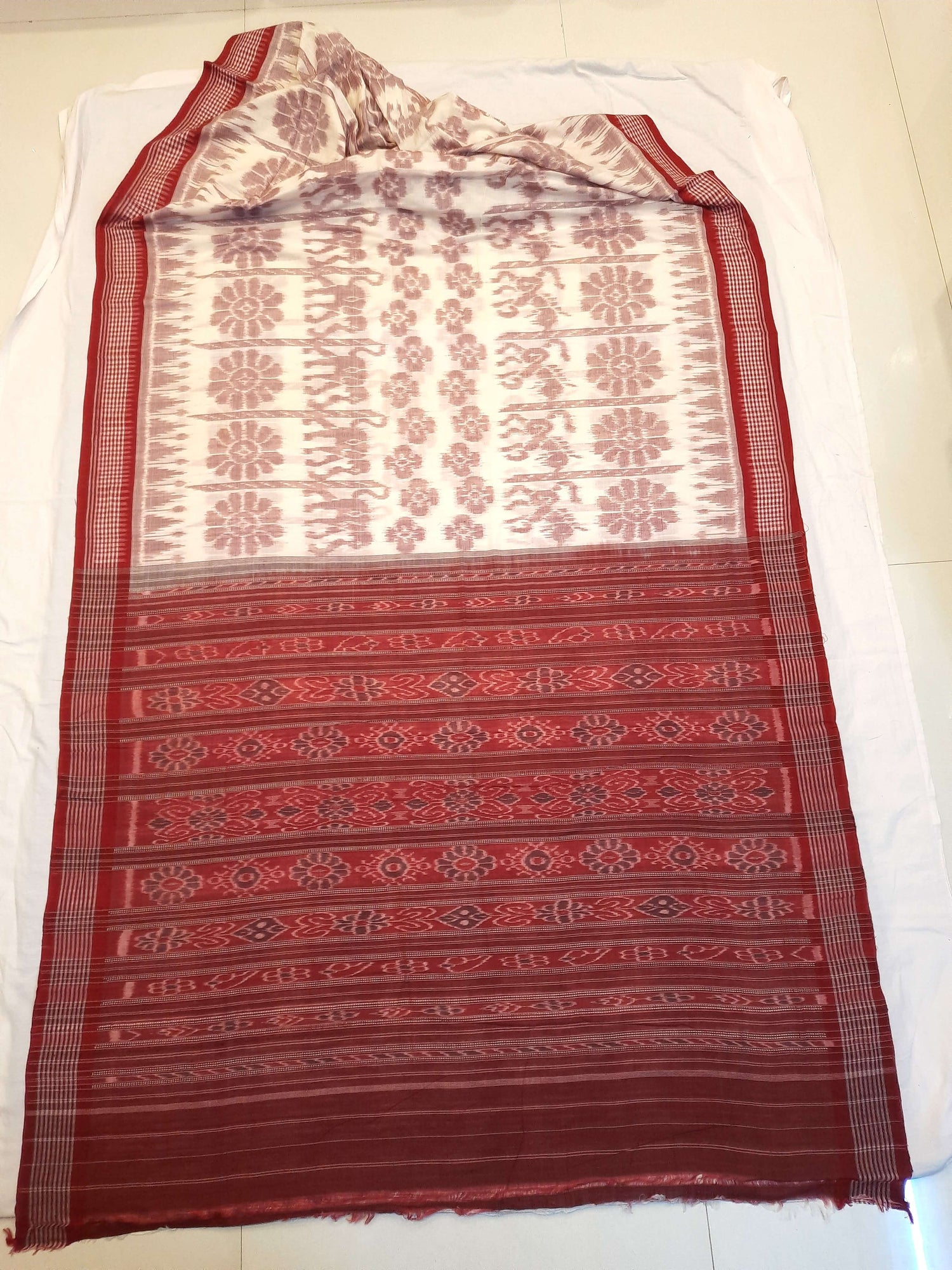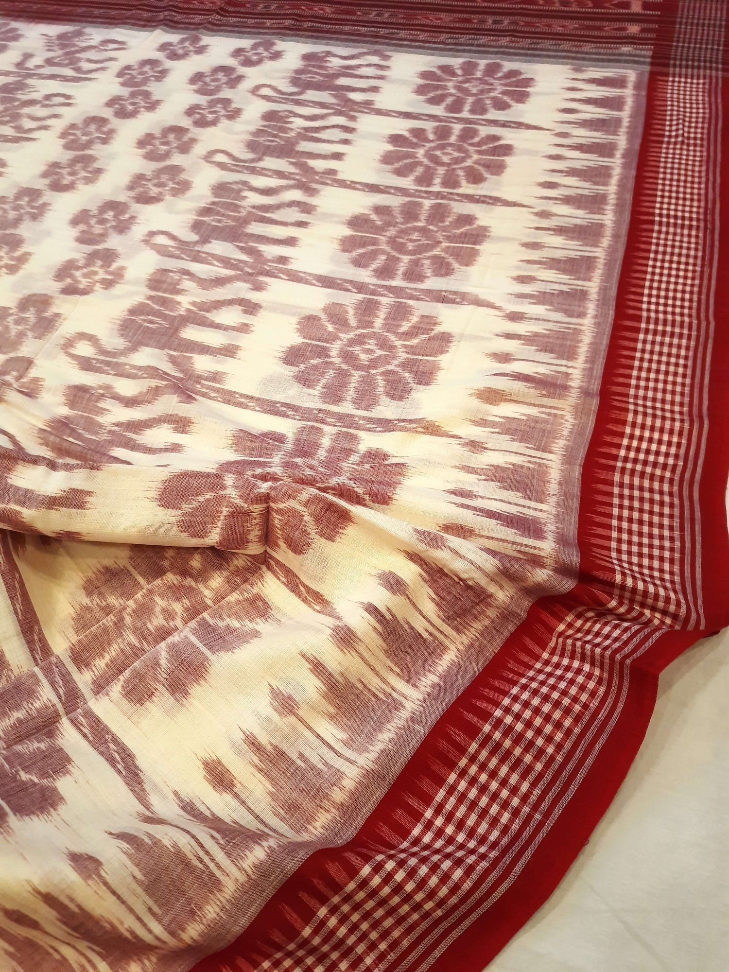 White with Red Cotton Odisha Ikat saree with mix match cotton ikat blouse piece