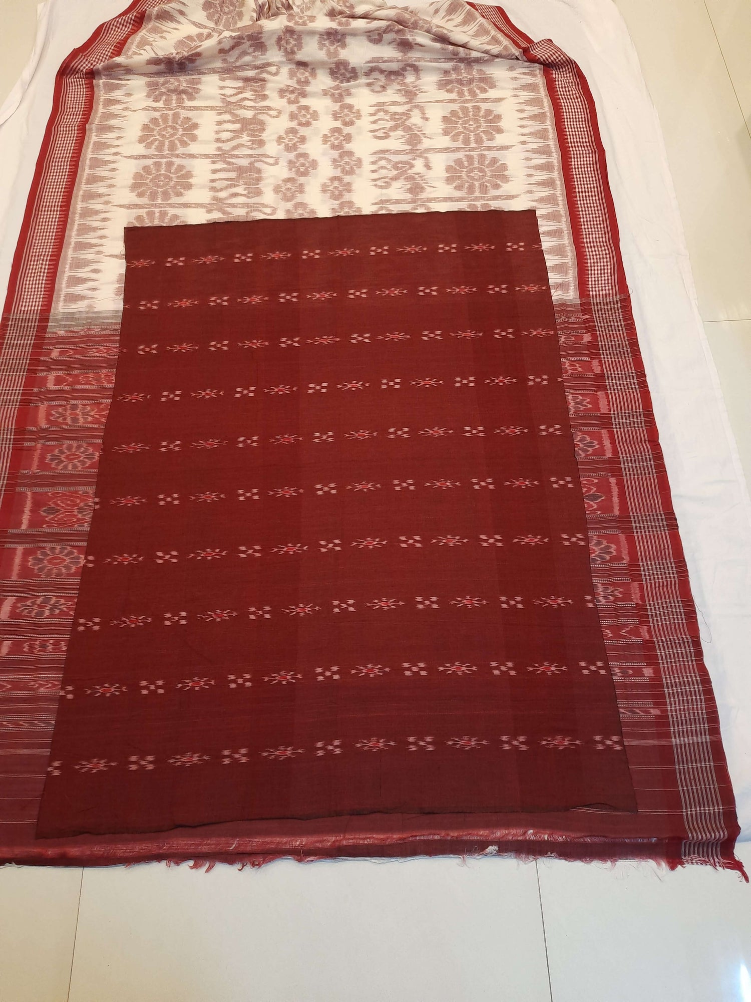 Beige with Maroon Cotton Odisha Ikat saree with mix match cotton ikat blouse