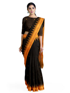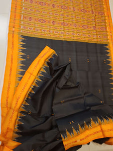 Black with Orange Odisha Khandua Patta Silk Saree paired with cotton ikat blouse piece