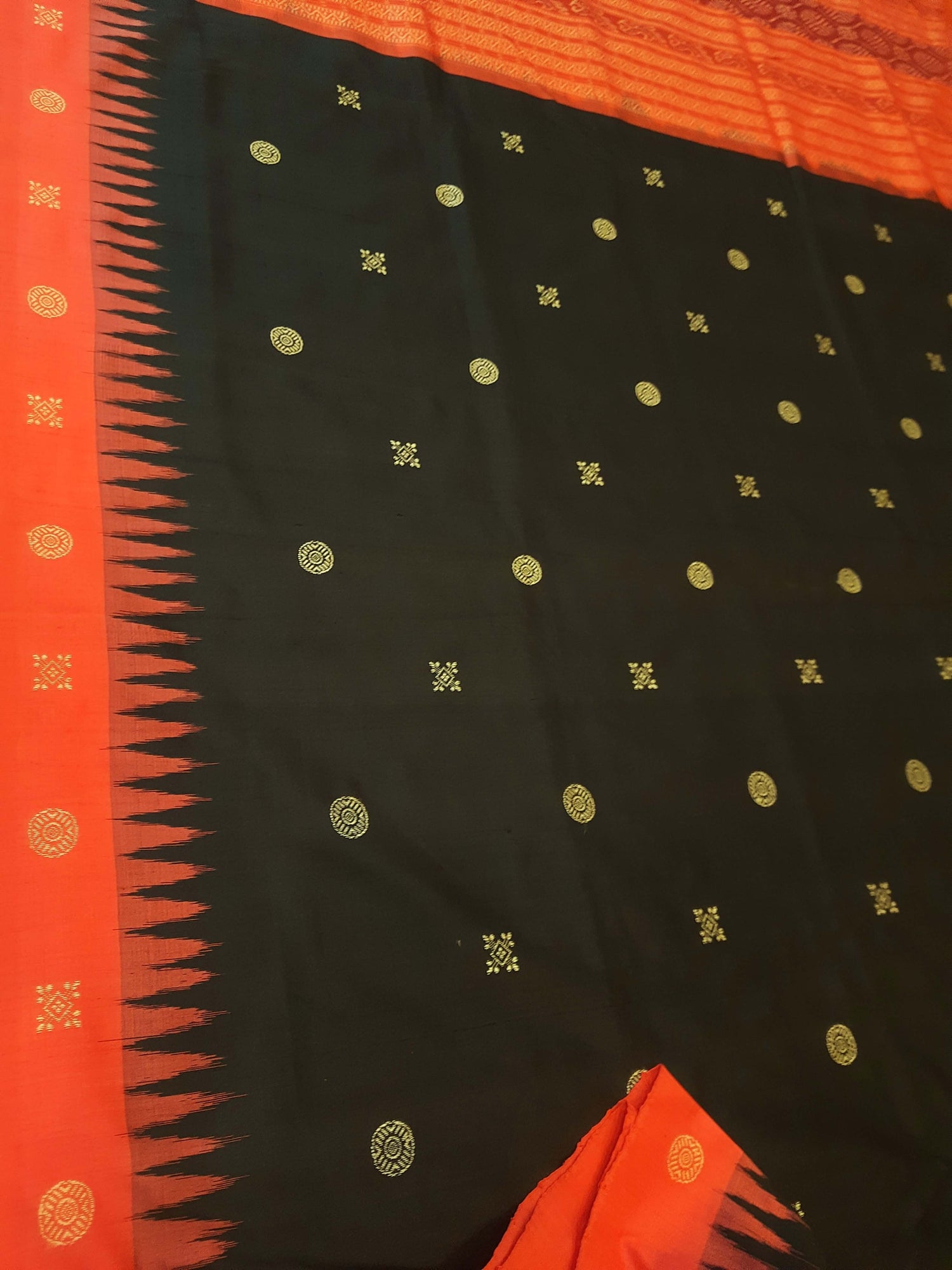 • Black Plain body with woven golden thread motifs Sambalpuri Silk Saree