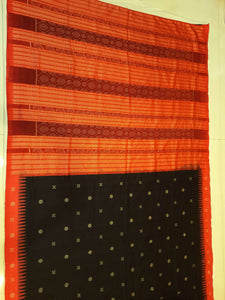 Black with Tamoto Red Sambalpuri Silk Saree with running plain blouse piece