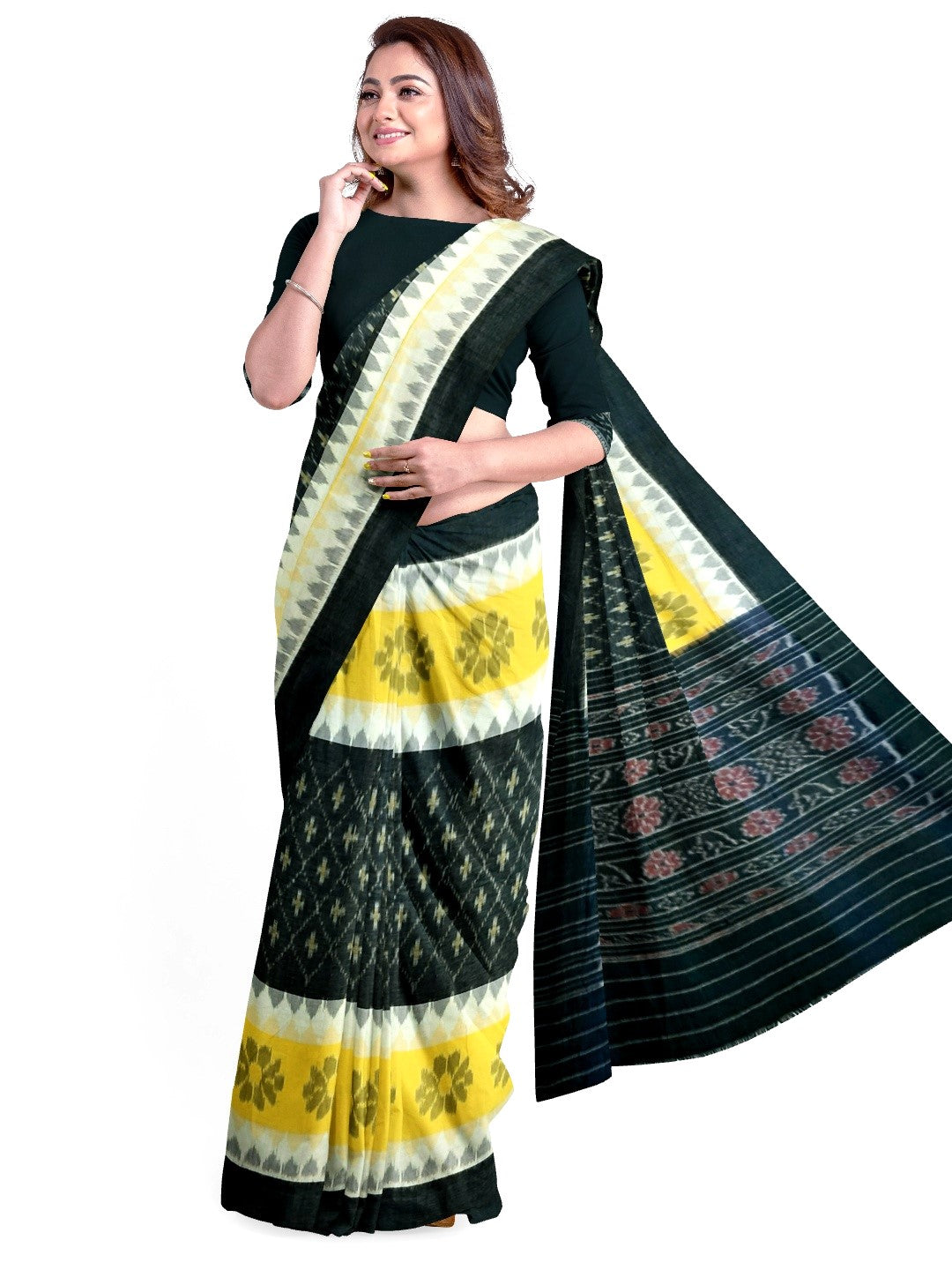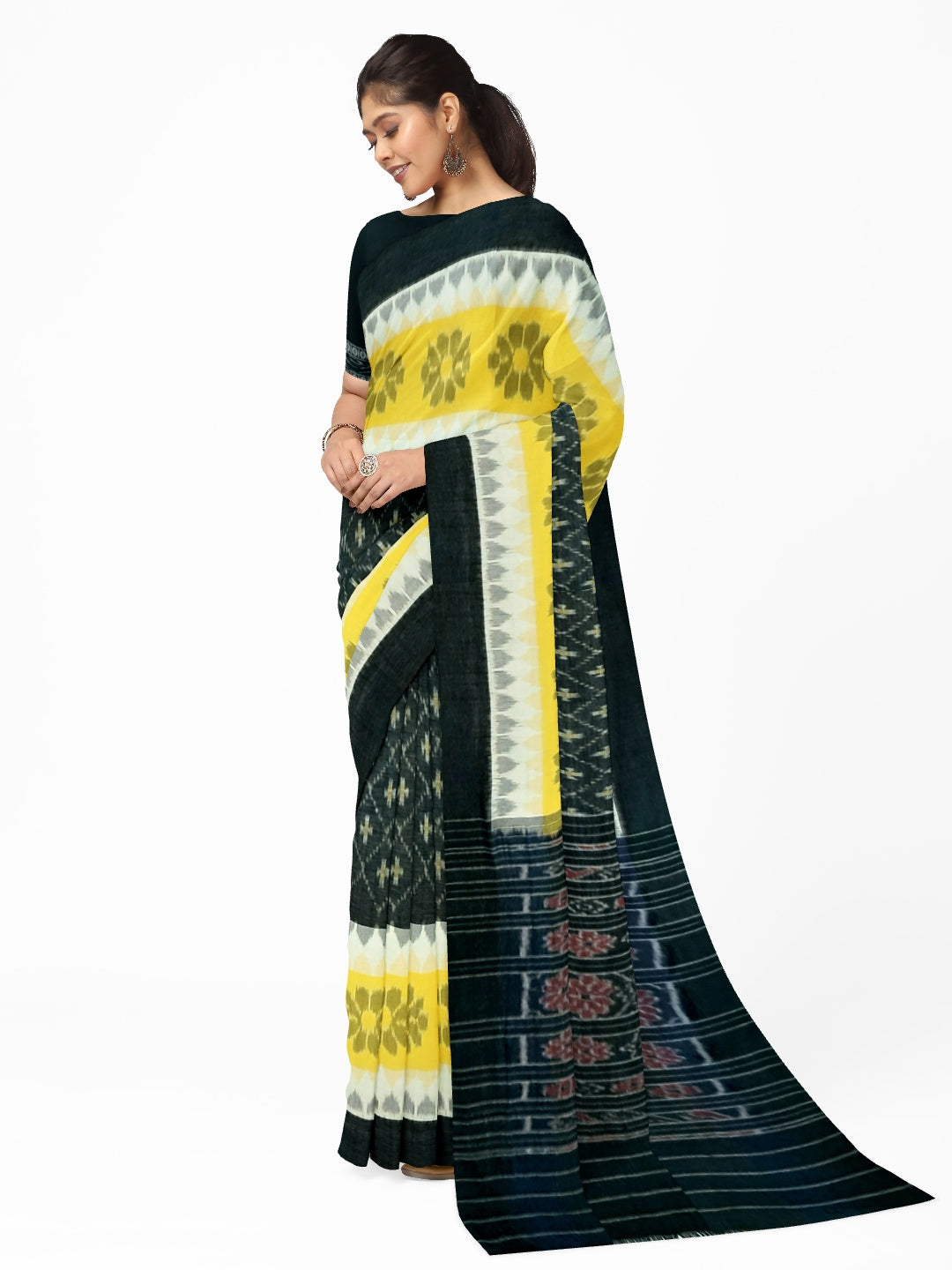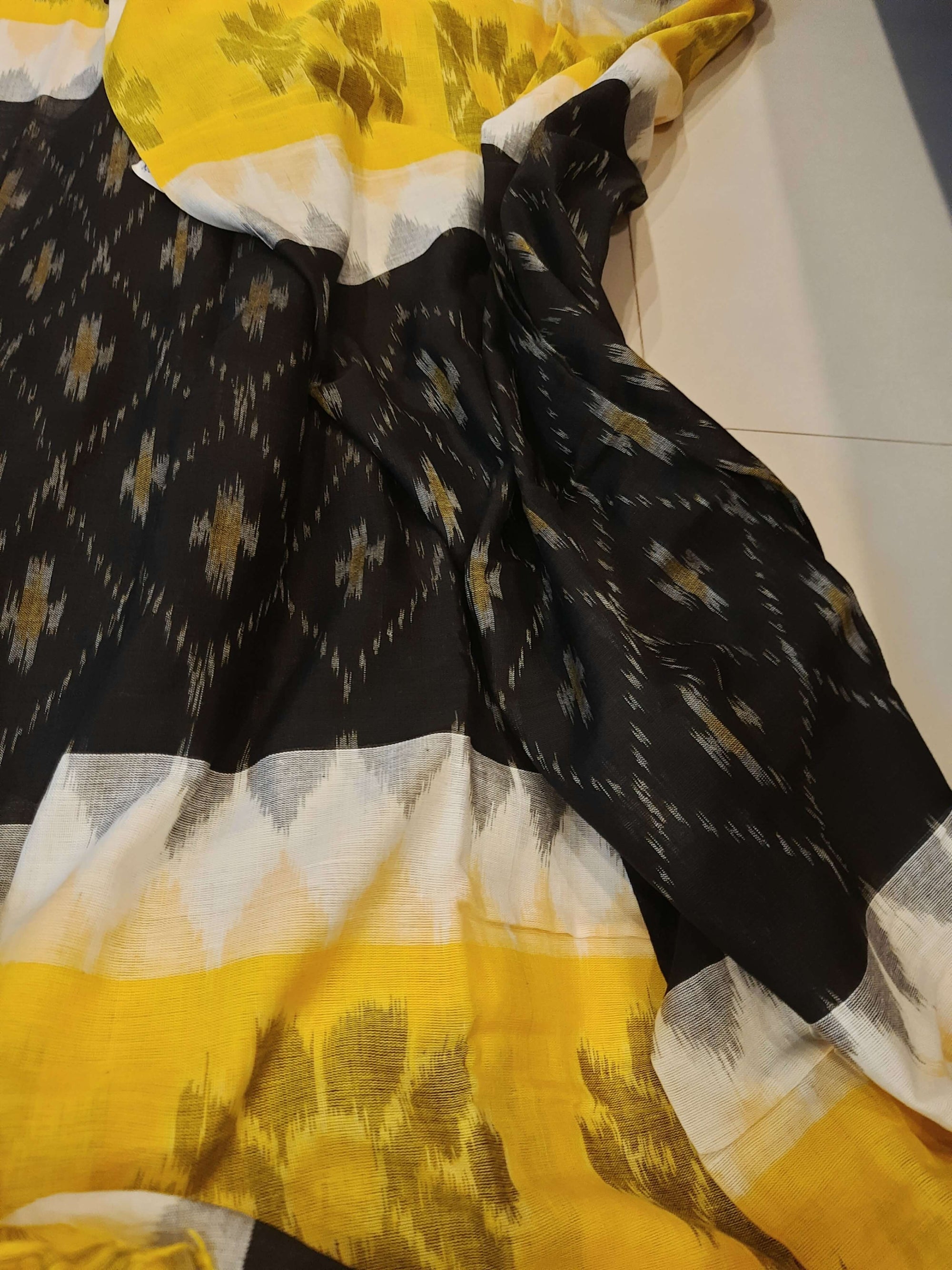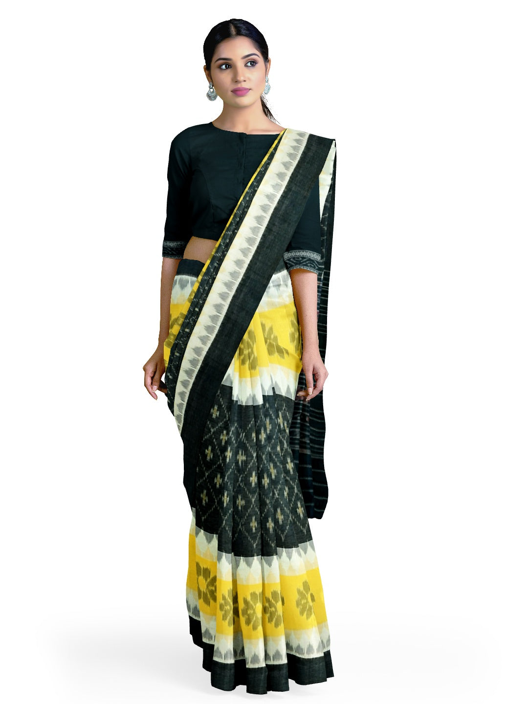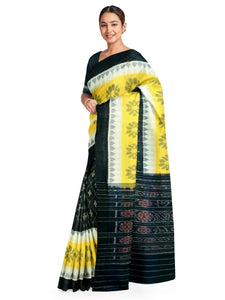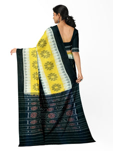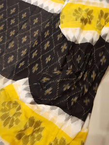 Black Yellow and White multi colour Cotton Odisha Ikat saree with cotton ikat blouse piece