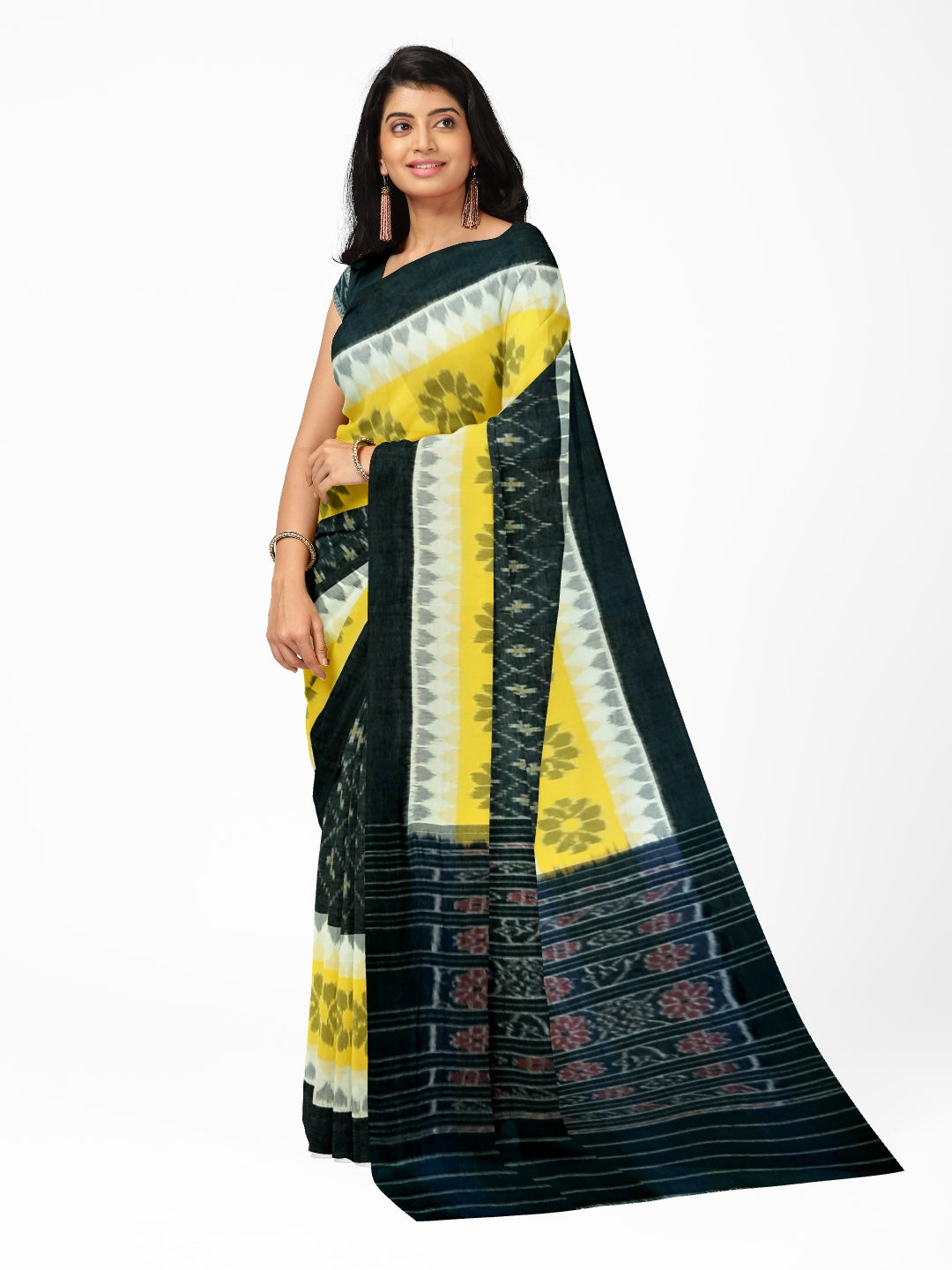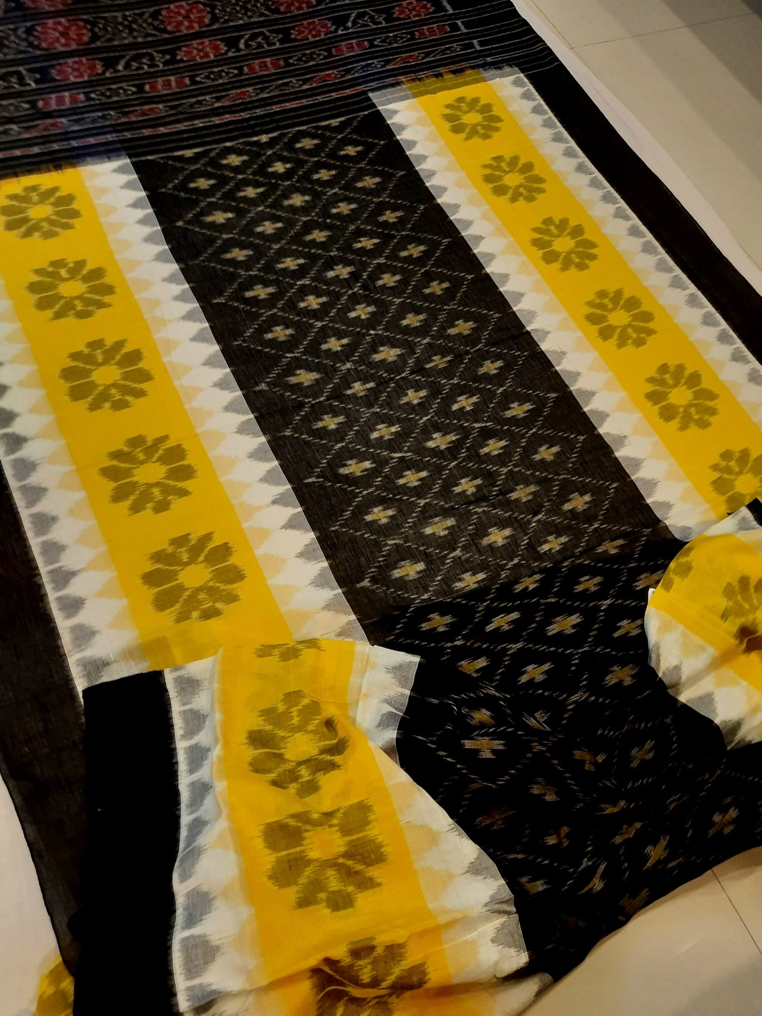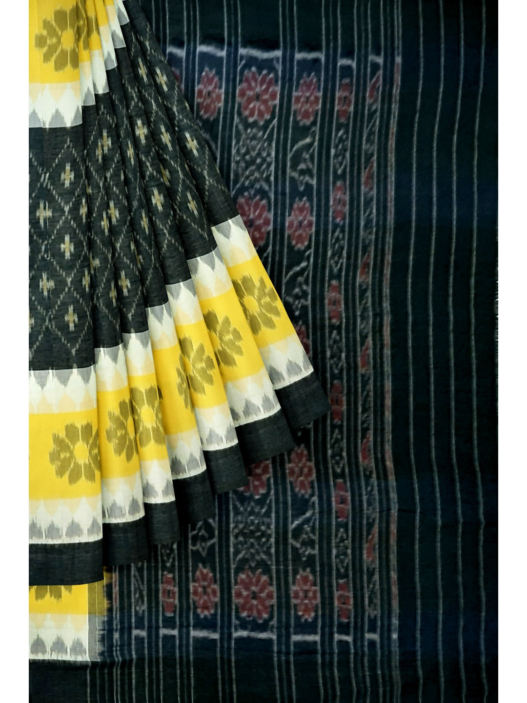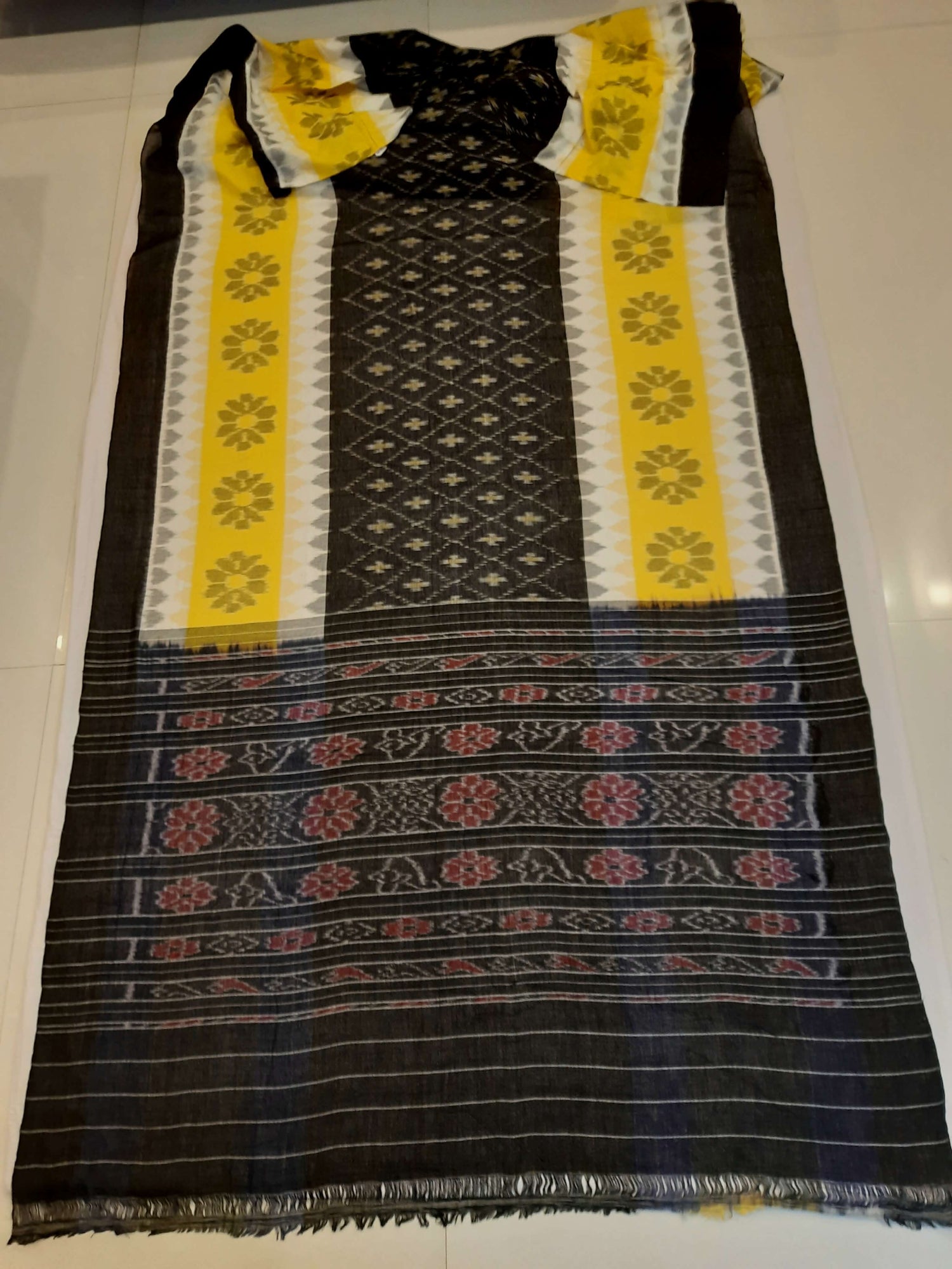 Black Yellow and White multi colour Cotton Odisha Ikat saree with cotton ikat blouse piece