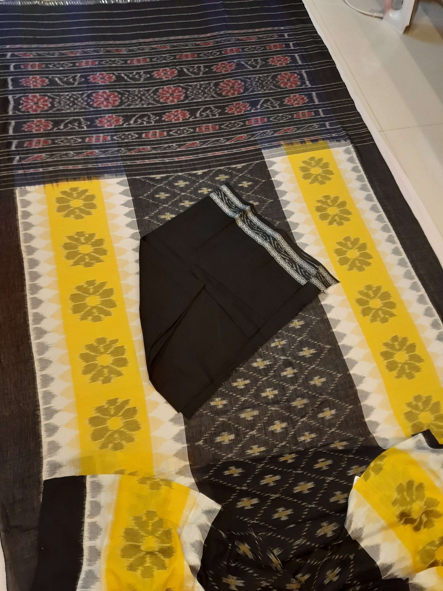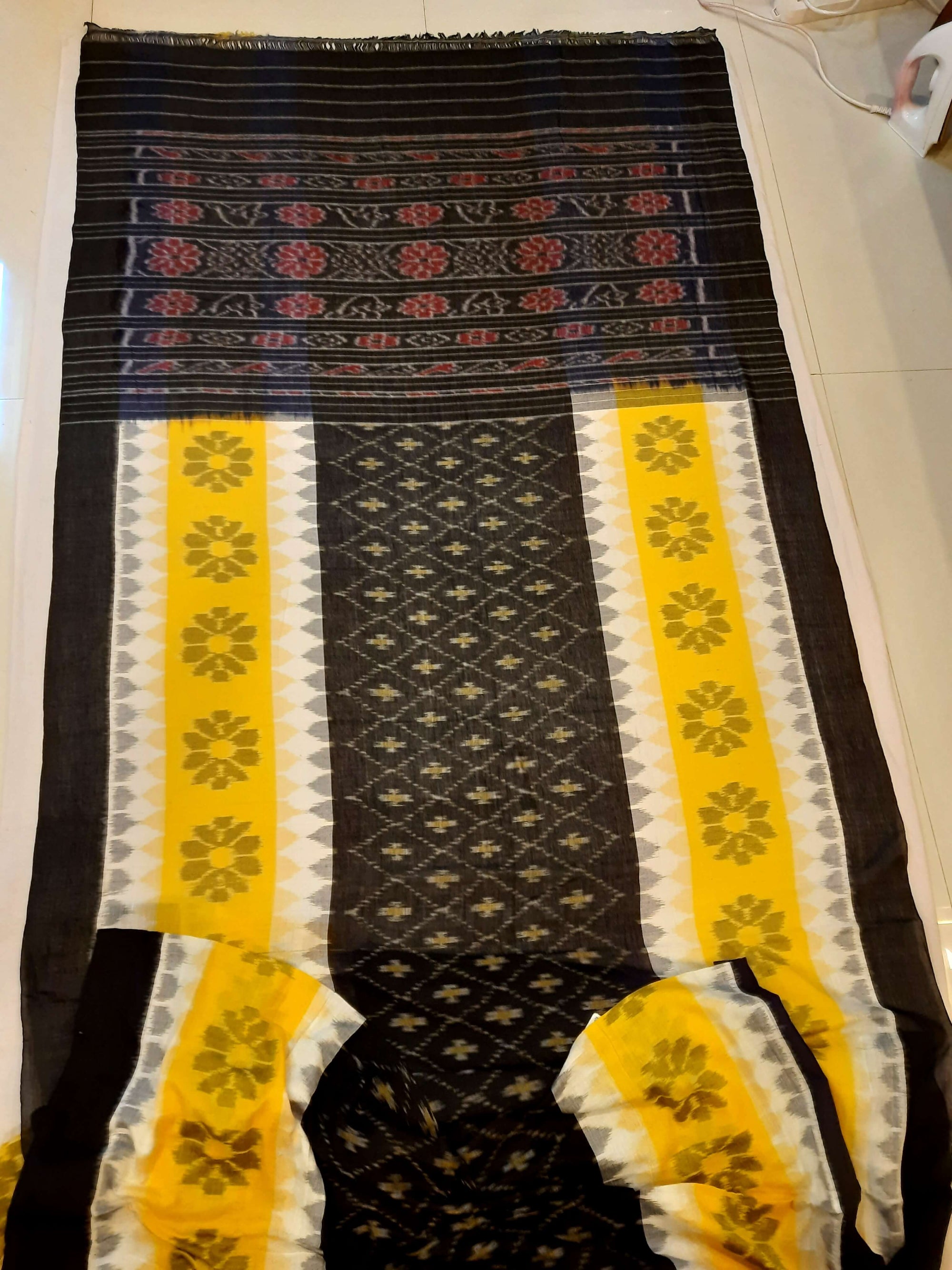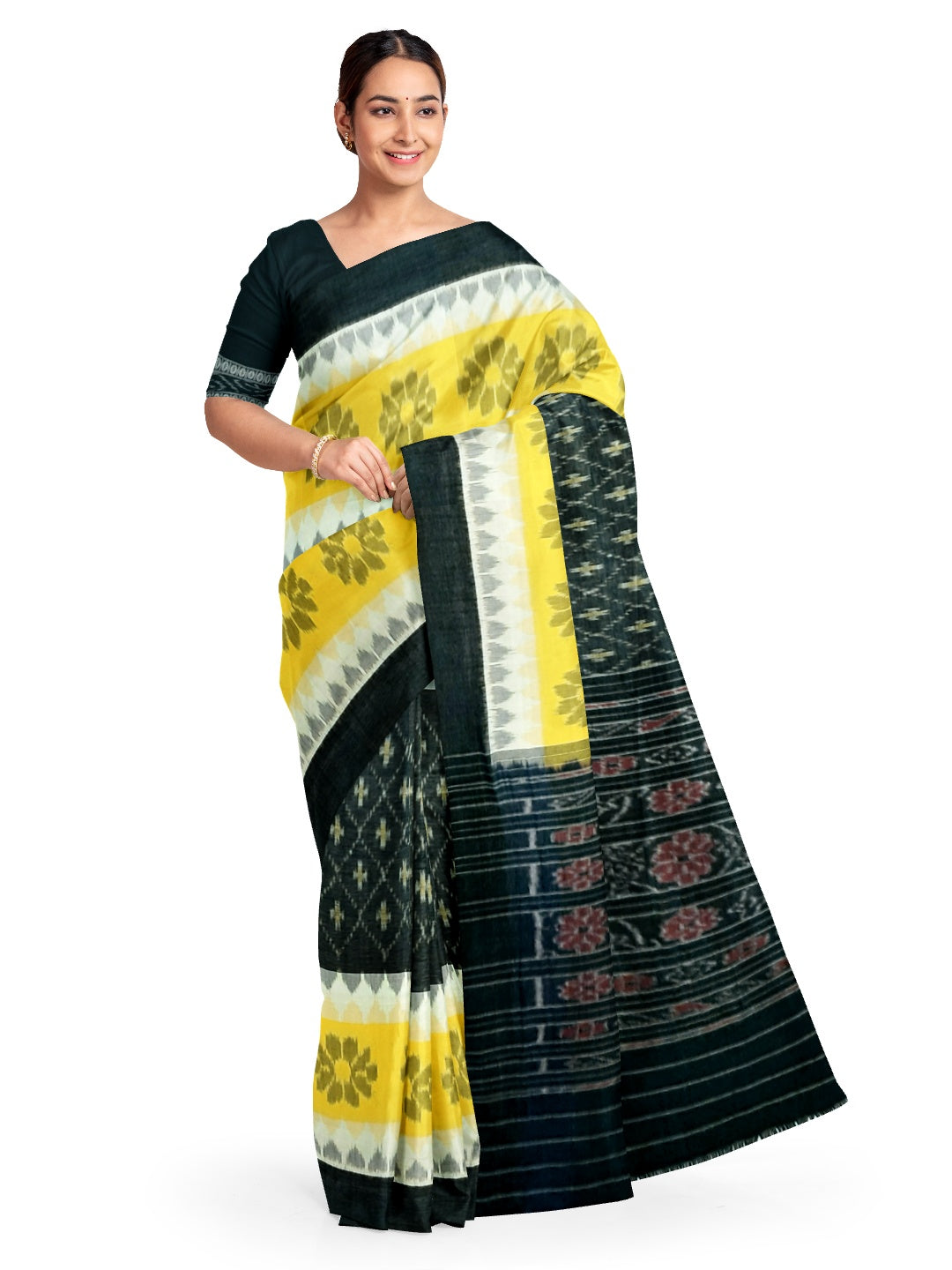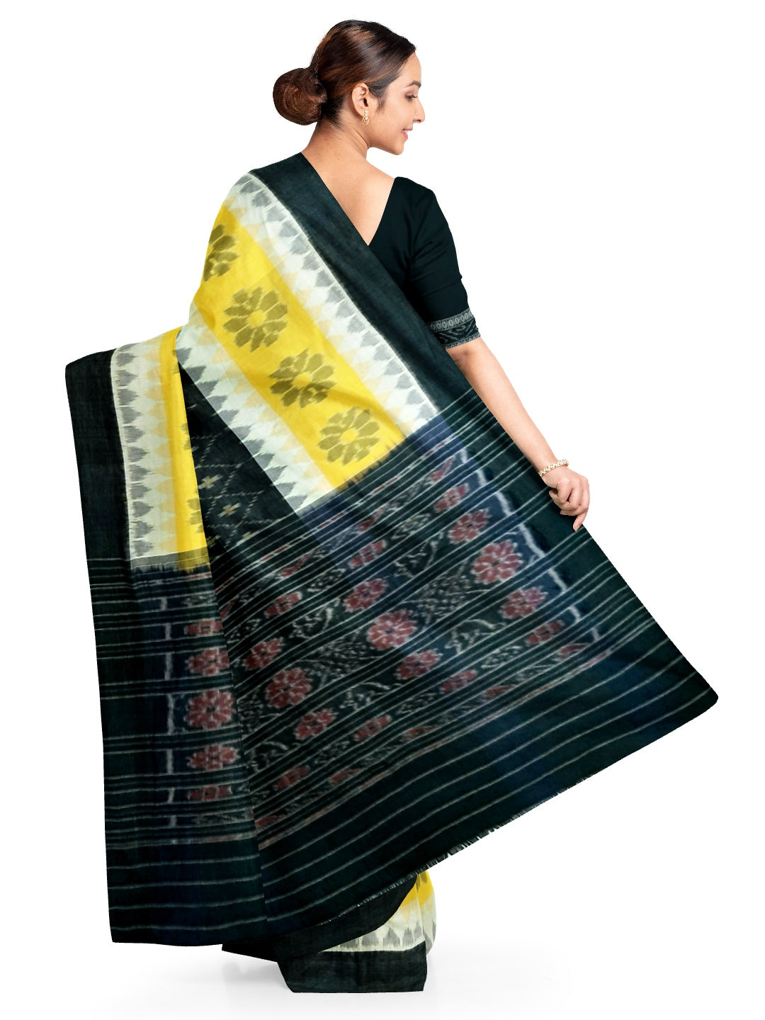 Black Yellow and White multi colour Cotton Odisha Ikat saree with cotton ikat blouse piece