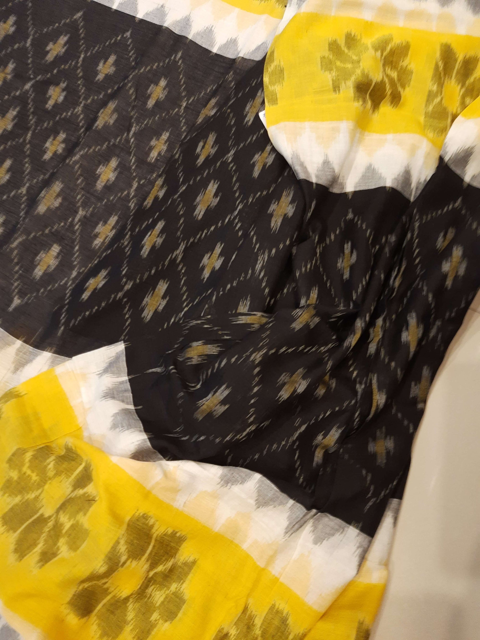 - Ikat Elegance with White Black and Yellow multi color cotton ikat saree Suta Luga