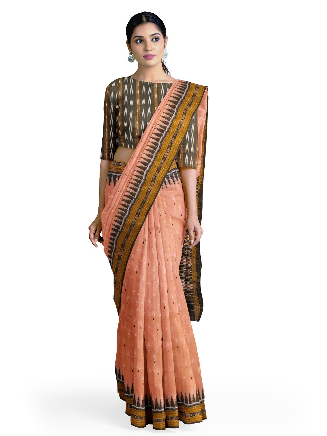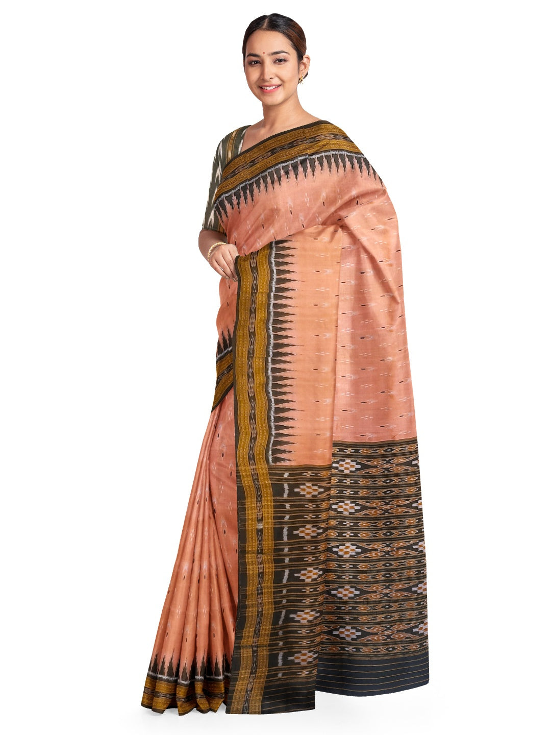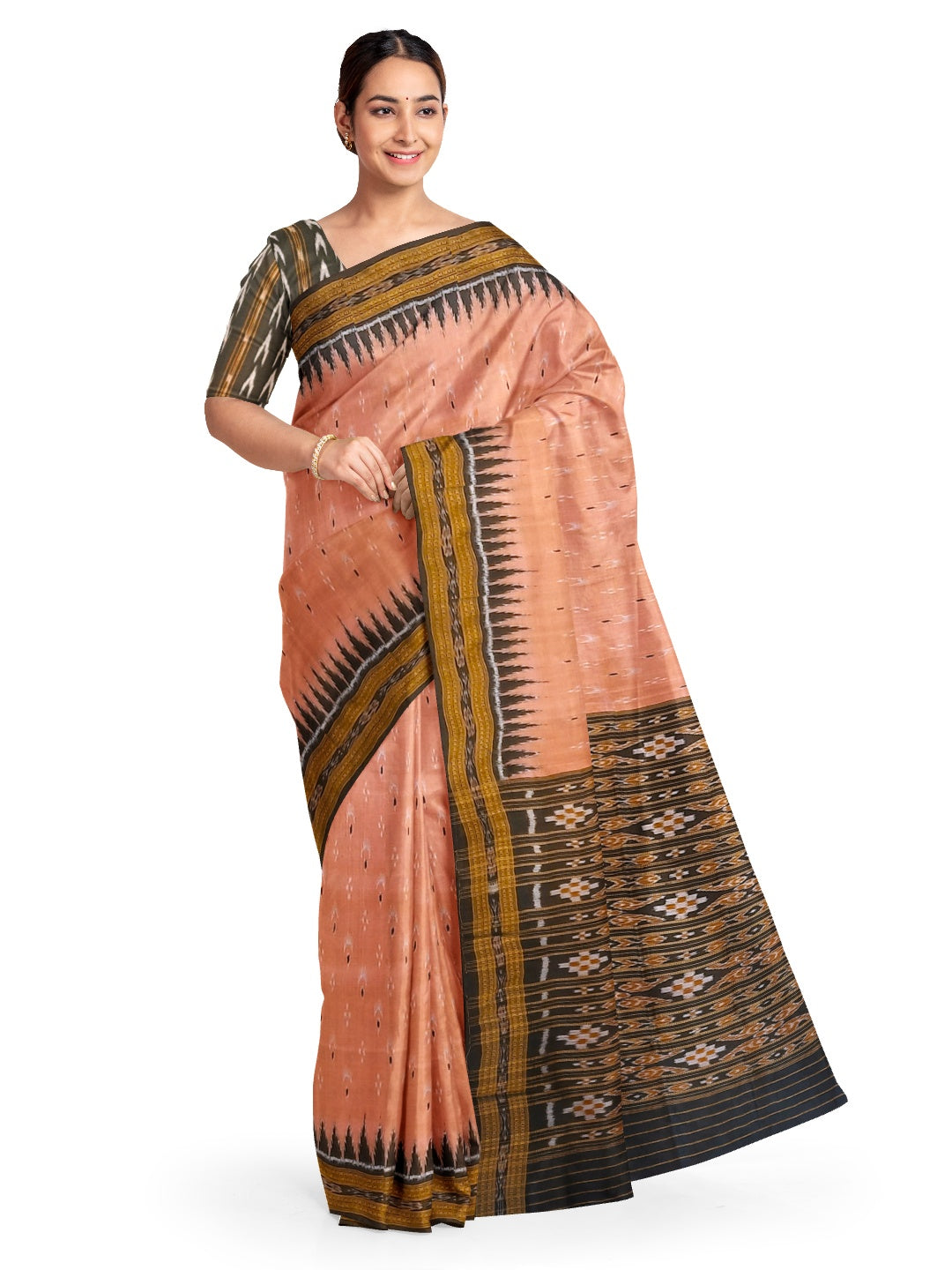 Peach Odisha Khandua Pata Silk Saree with cotton ikat blouse piece