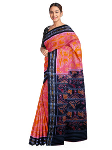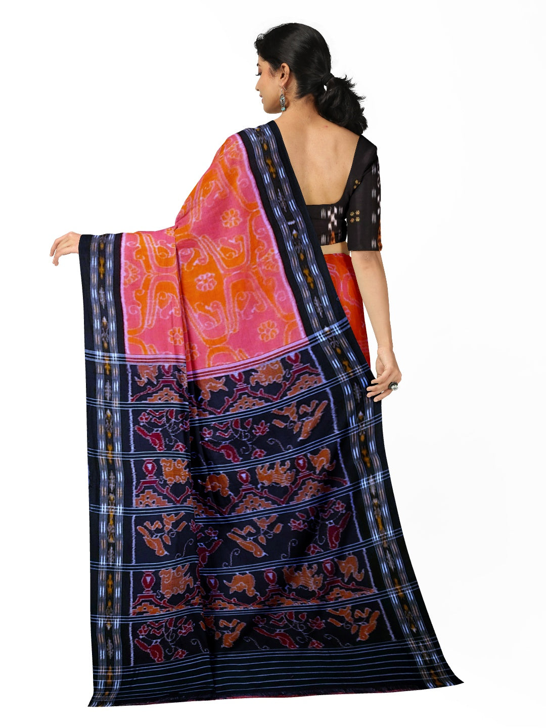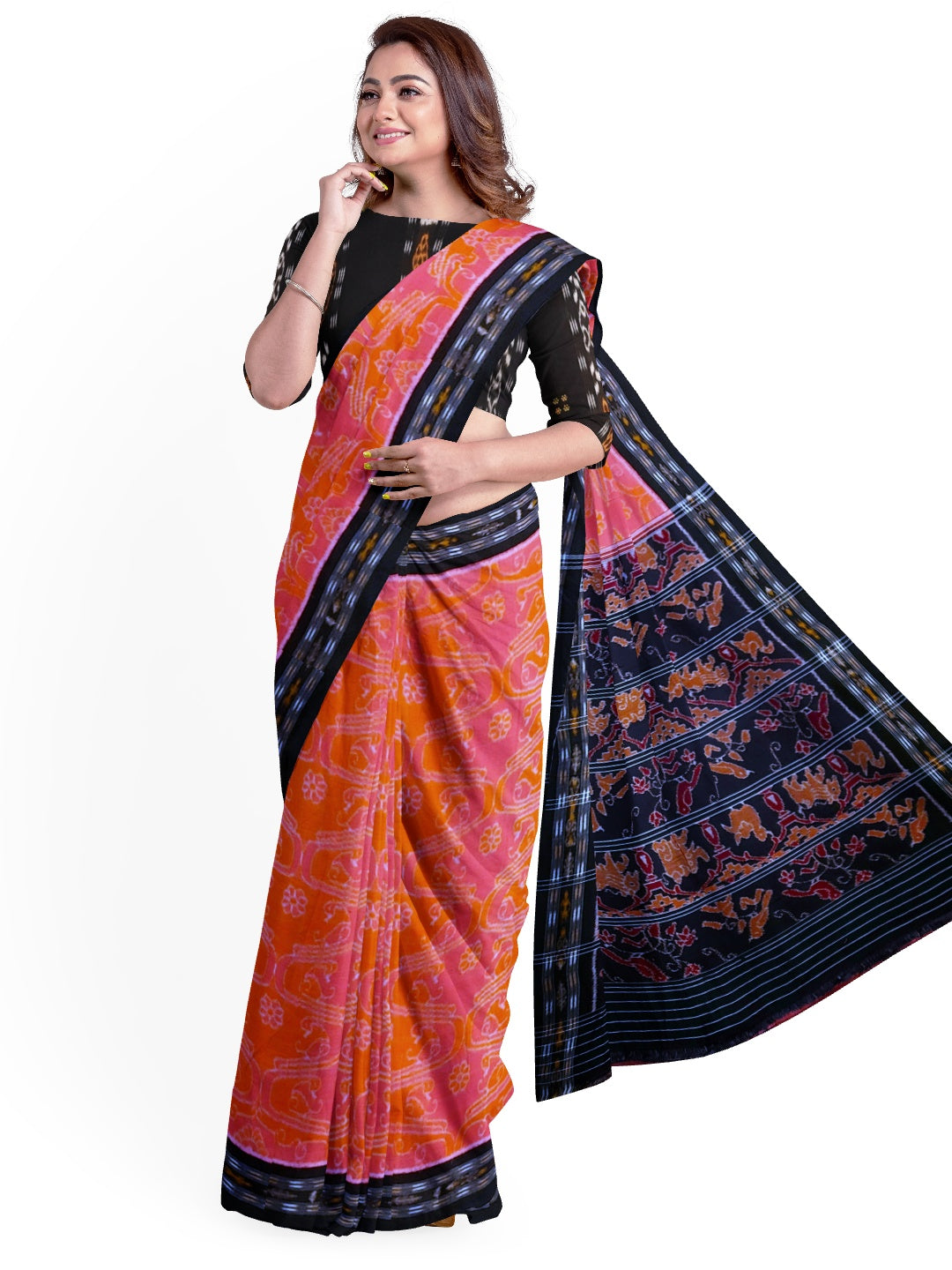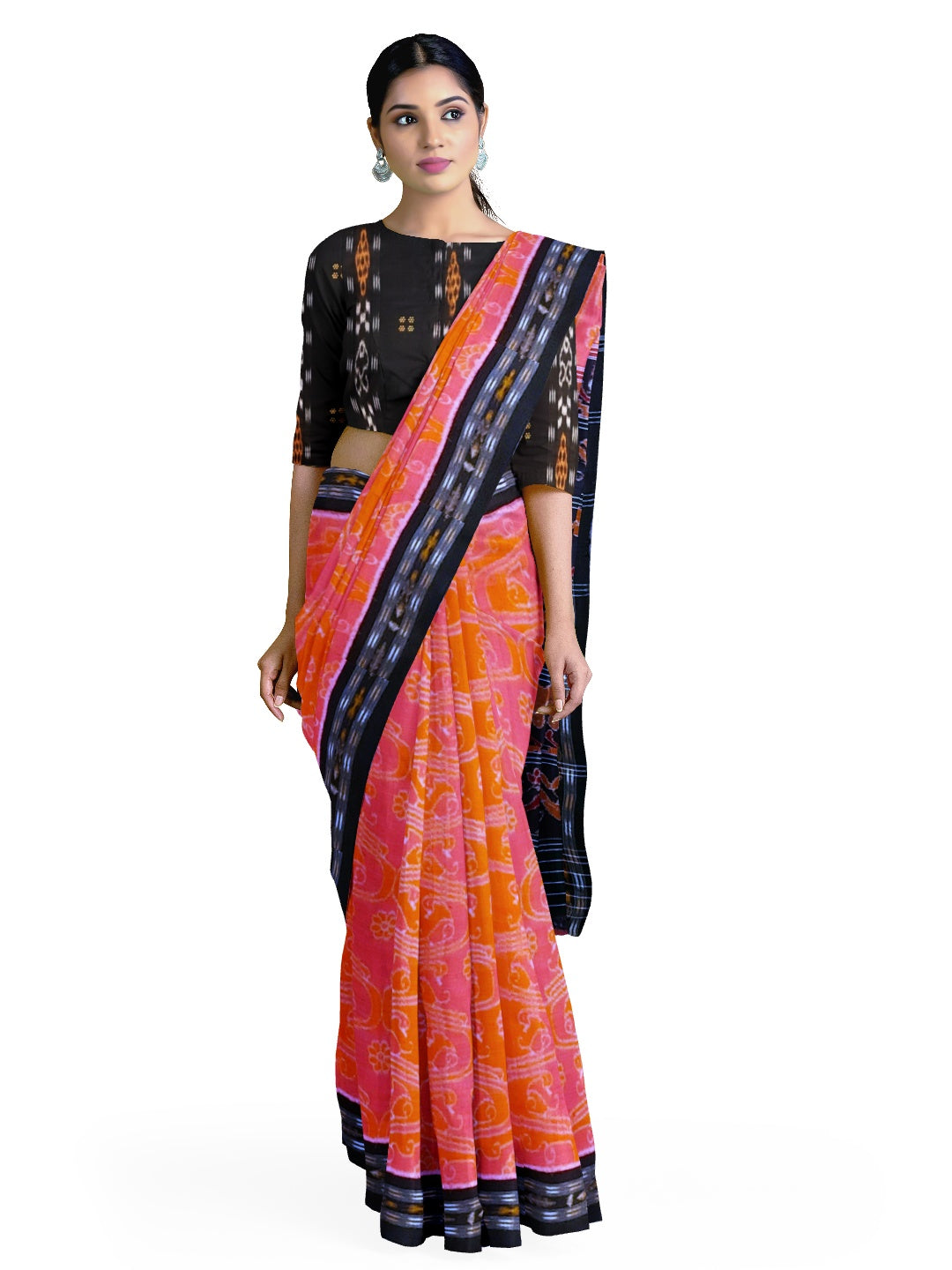 Pink and Orange Odisha Ikat saree with matching cotton ikat blouse piece