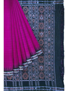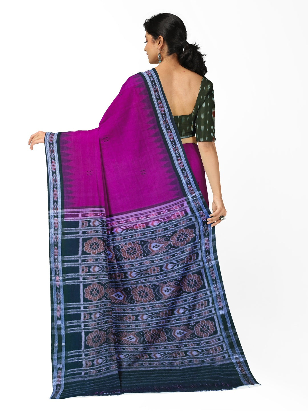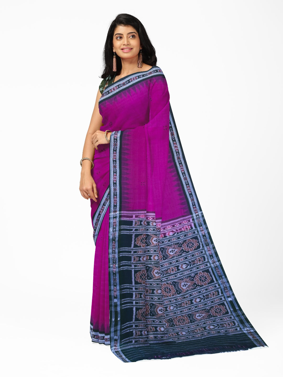 - Purple plain body cototn saree with thin ikat black border and traditional anchal