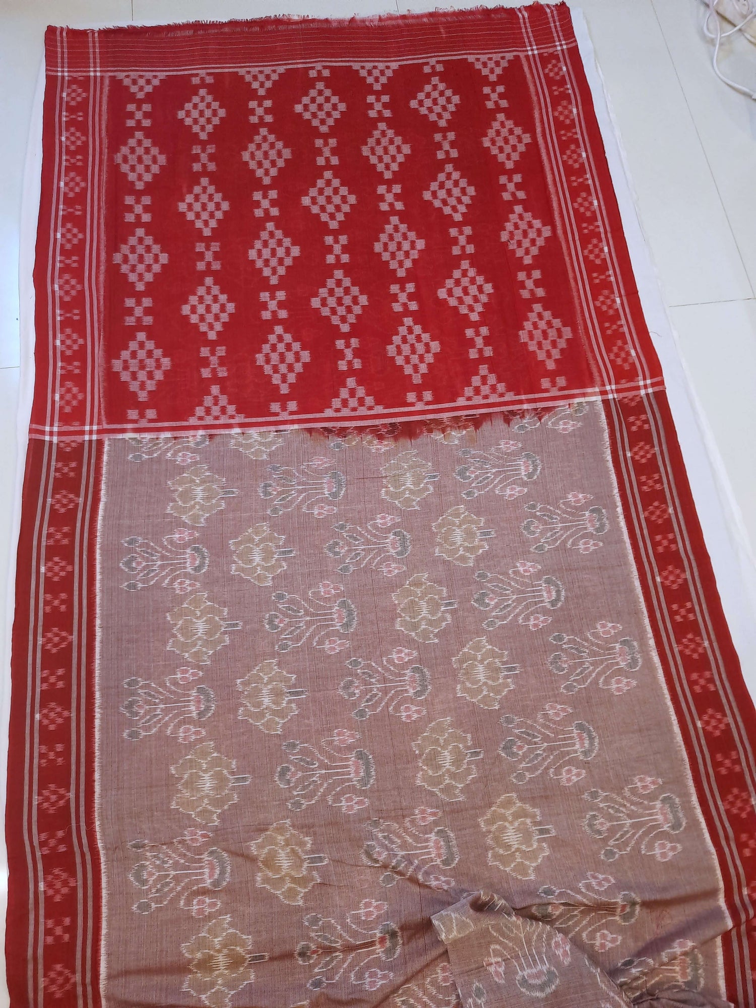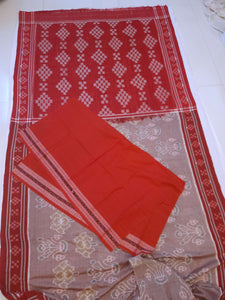 White with Red Cotton Odisha Ikat saree with mix match cotton ikat blouse piece