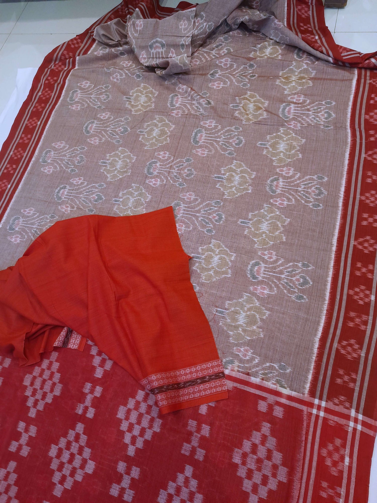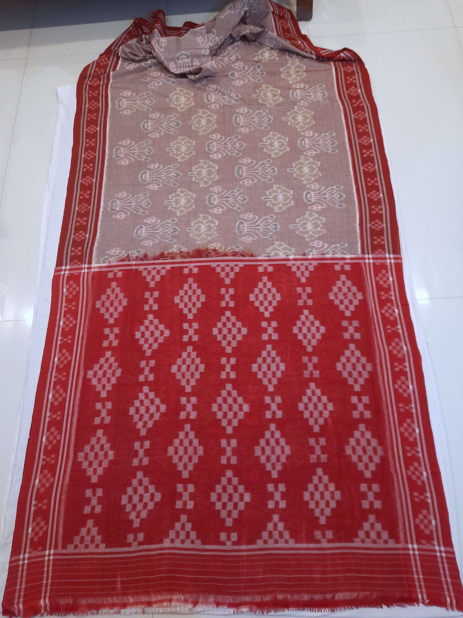 Beige with Maroon Cotton Odisha Ikat saree with mix match cotton ikat blouse