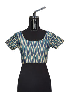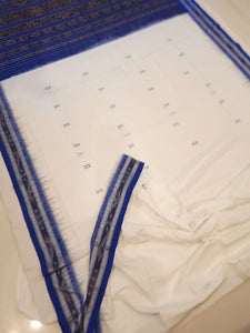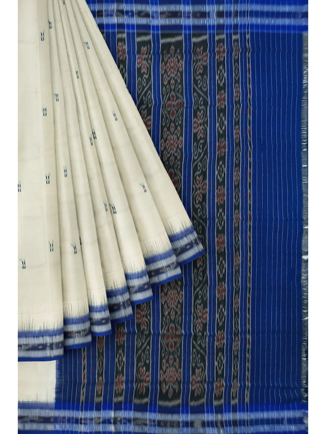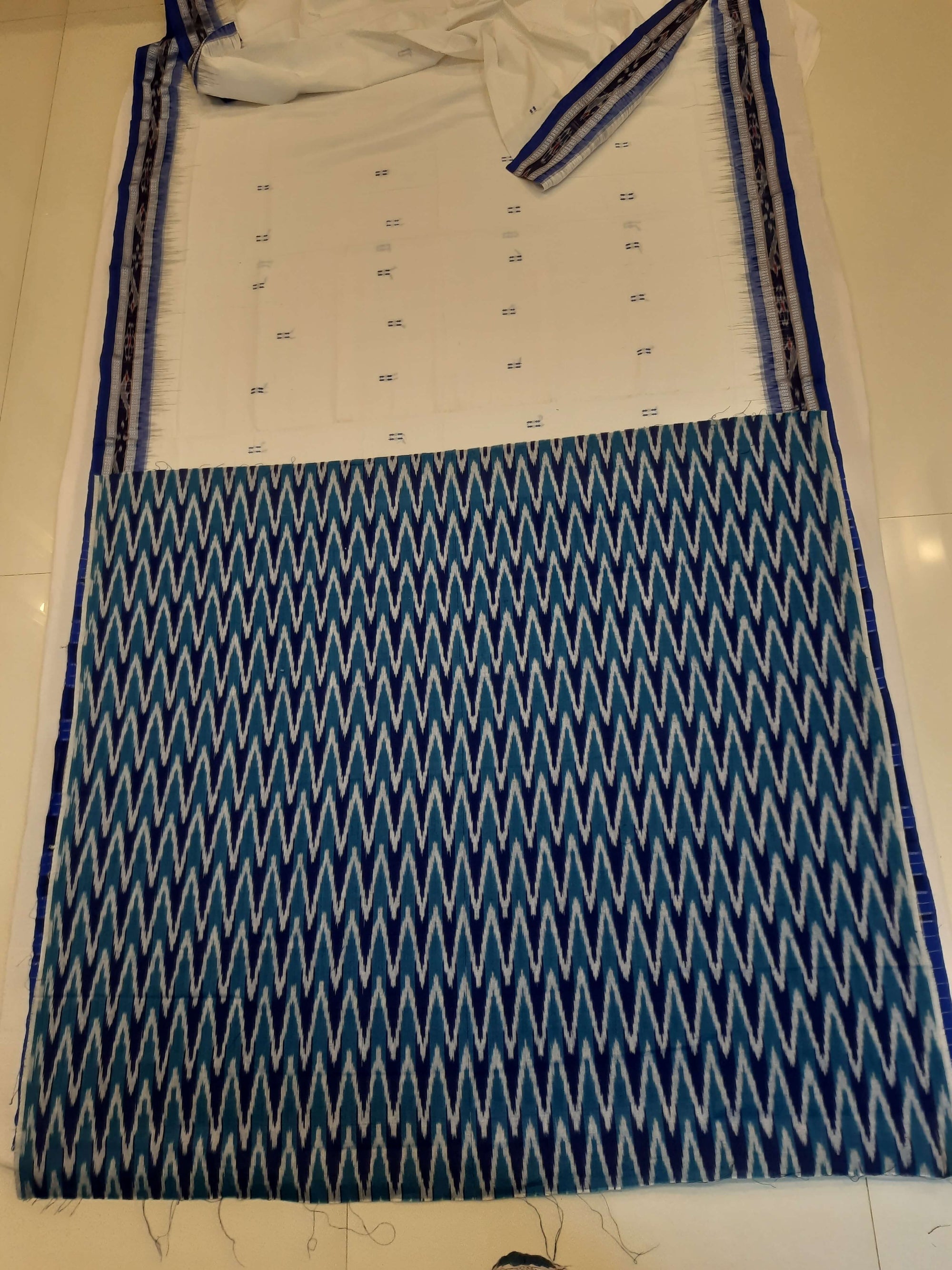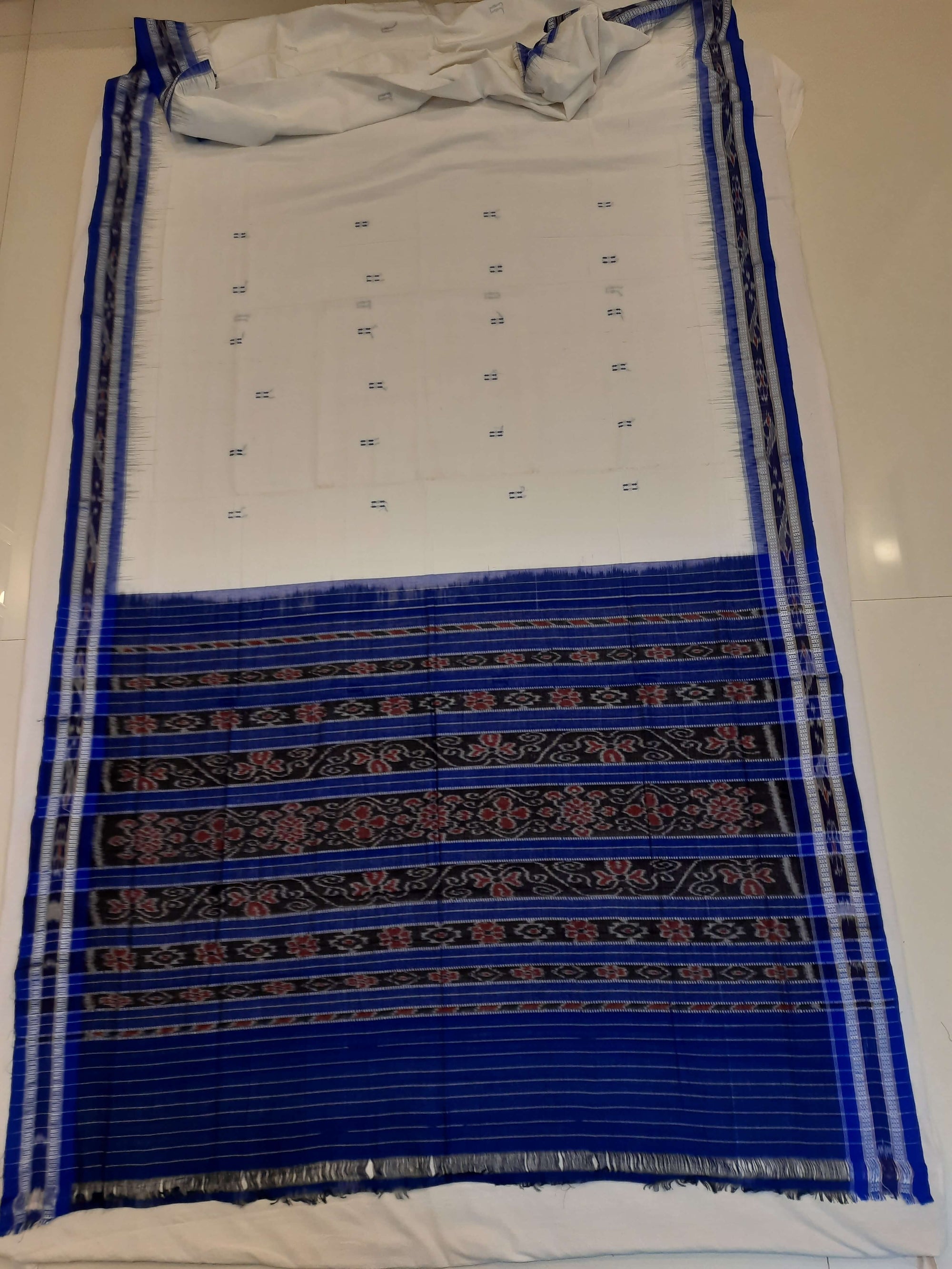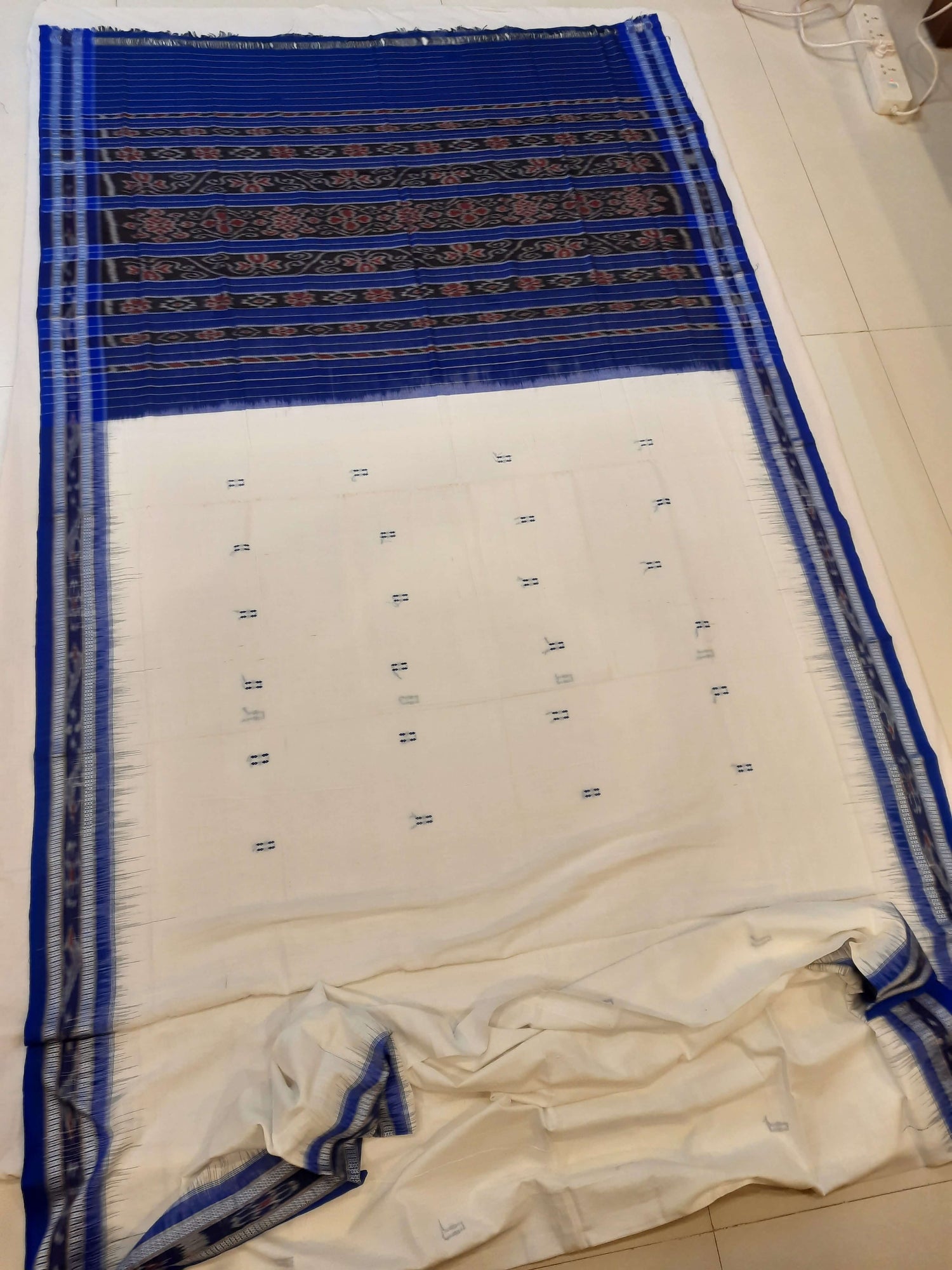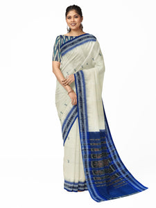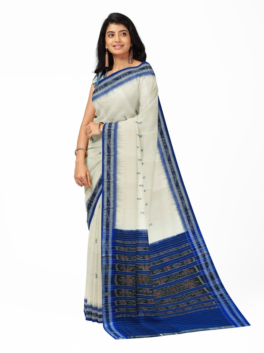 White with Blue Cotton Odisha Ikat saree with cotton ikat blouse piece