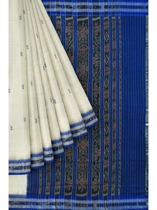- White plain body cototn saree with ikat Blue border and traditional anchal